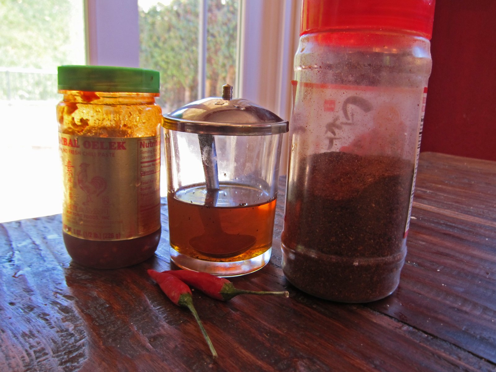 Some red chilies, ground red chilies, sambal olek, and home made chili oil.