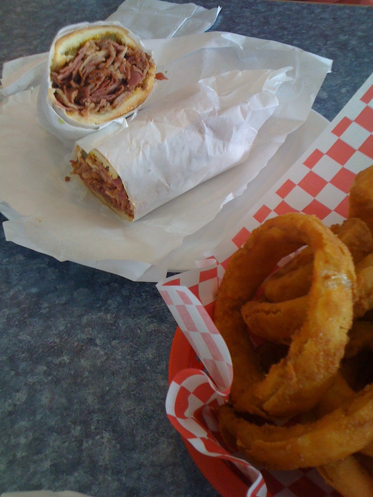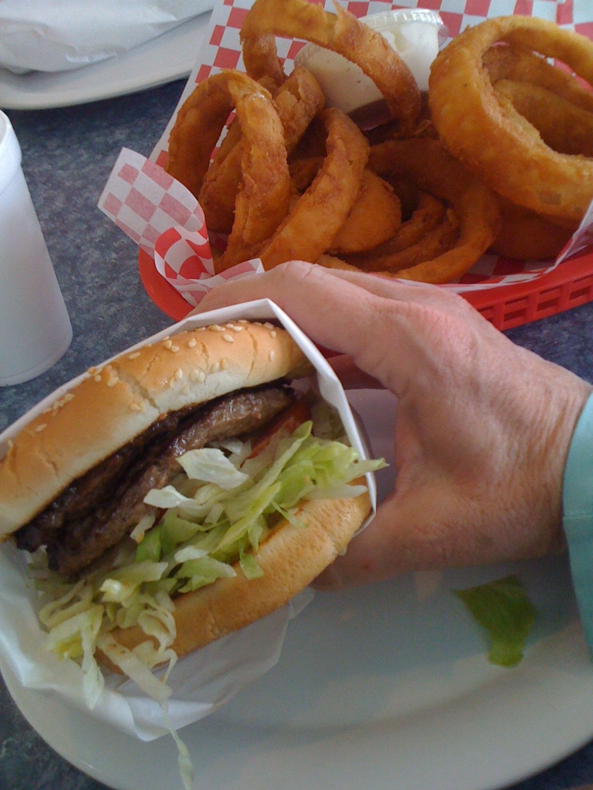 As you can see, this is a Double Burger ($4.19). If you recall my mention on other posts, places which serve gyros make really good thick cut onion rings ($3.85). The burger was juicy, flavorful, hand formed and served on a toasted bun with lettuce tomato, onion and pickles. Mustard and mayonnaise were available on the side and not necessary.