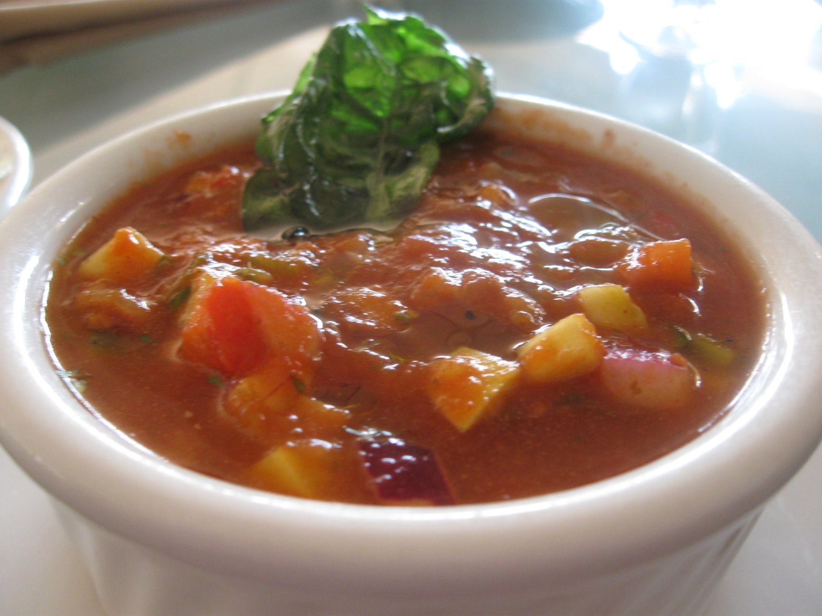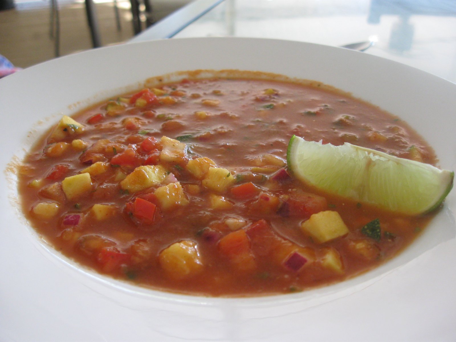 The quality of the fresh tomatoes shined throughout. The dice of zucchini, yellow squash, red onion and fresh peppers added flavor and varied the texture. A citrus sourness and a jalapeno heat balanced the cool sweetness of the tomatoes.
