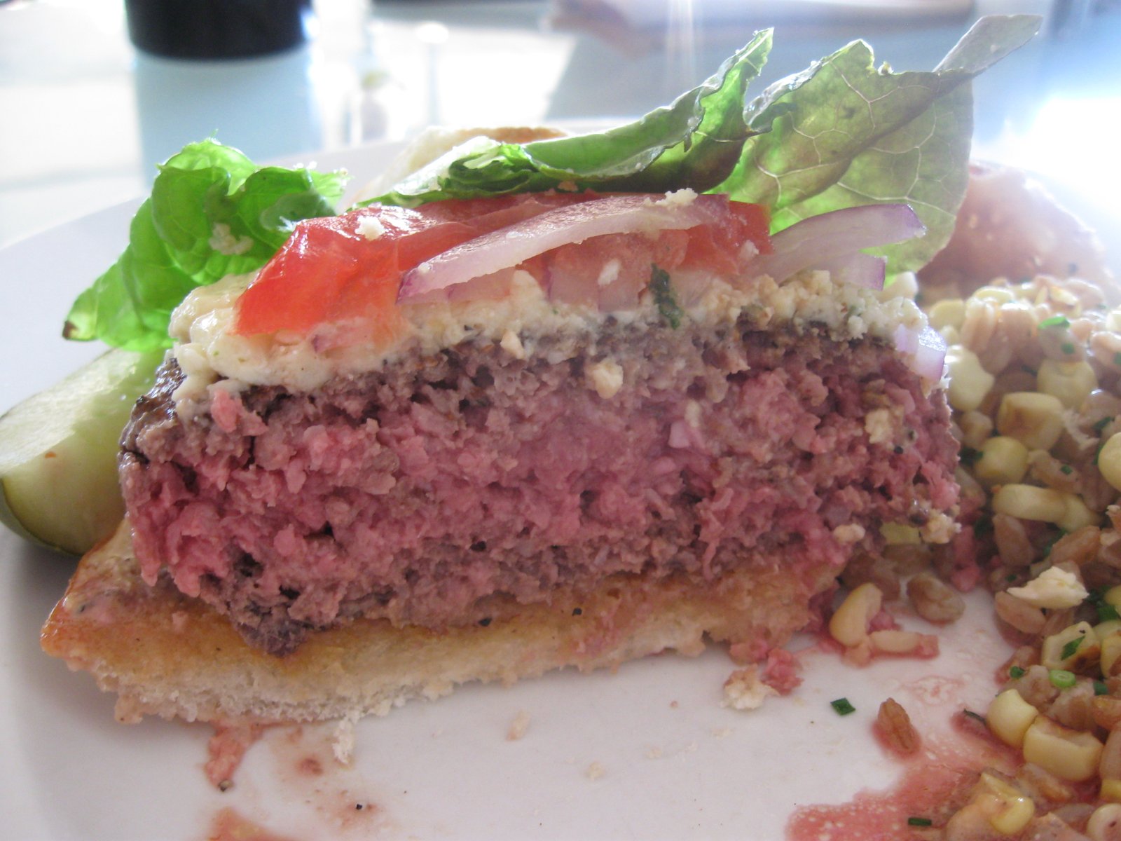 The accompaniment for the bison burger was something new to me – fresh cut California corn mixed with farro, which the waiter spelled out and identified as an Egyptian grain (in that case, shouldn't it be spelled Pharaoh?). According to Wikipedia, farro seems to be a name used for three different types of primitive wheats – the sort of things that ancient Egyptians would have actually eaten. Not usually made into bread or pasta, it's normally served in the whole grain or berry fashion as in this dish. While unusual, I appreciated this accompaniment more than something like french fries. The sweet corn and whole-grain flavors and chewy textures were a nice contrast to the rest of the plate.
