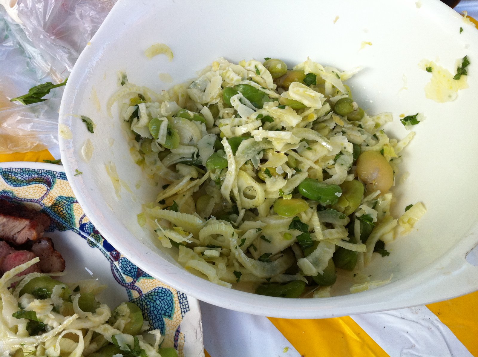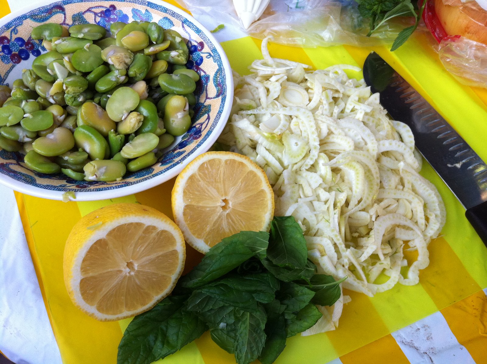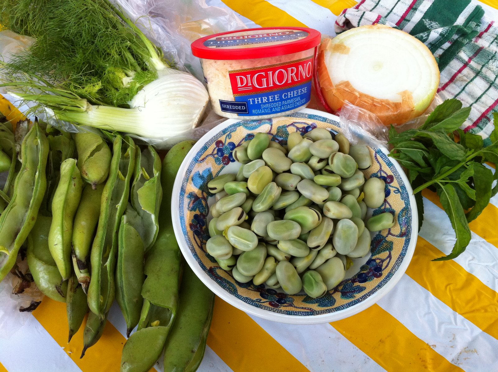 These are the primary ingredients (also the juice of one lemon, not in this photo). The fresh fava beans have been boiled, whole, in salted water, then cooled. Fava beans need to be shelled twice; first from the outer pod- once that cools, you can squeeze the pod and the beans shoot out easily- then you can remove the membrane covering the actual beans.