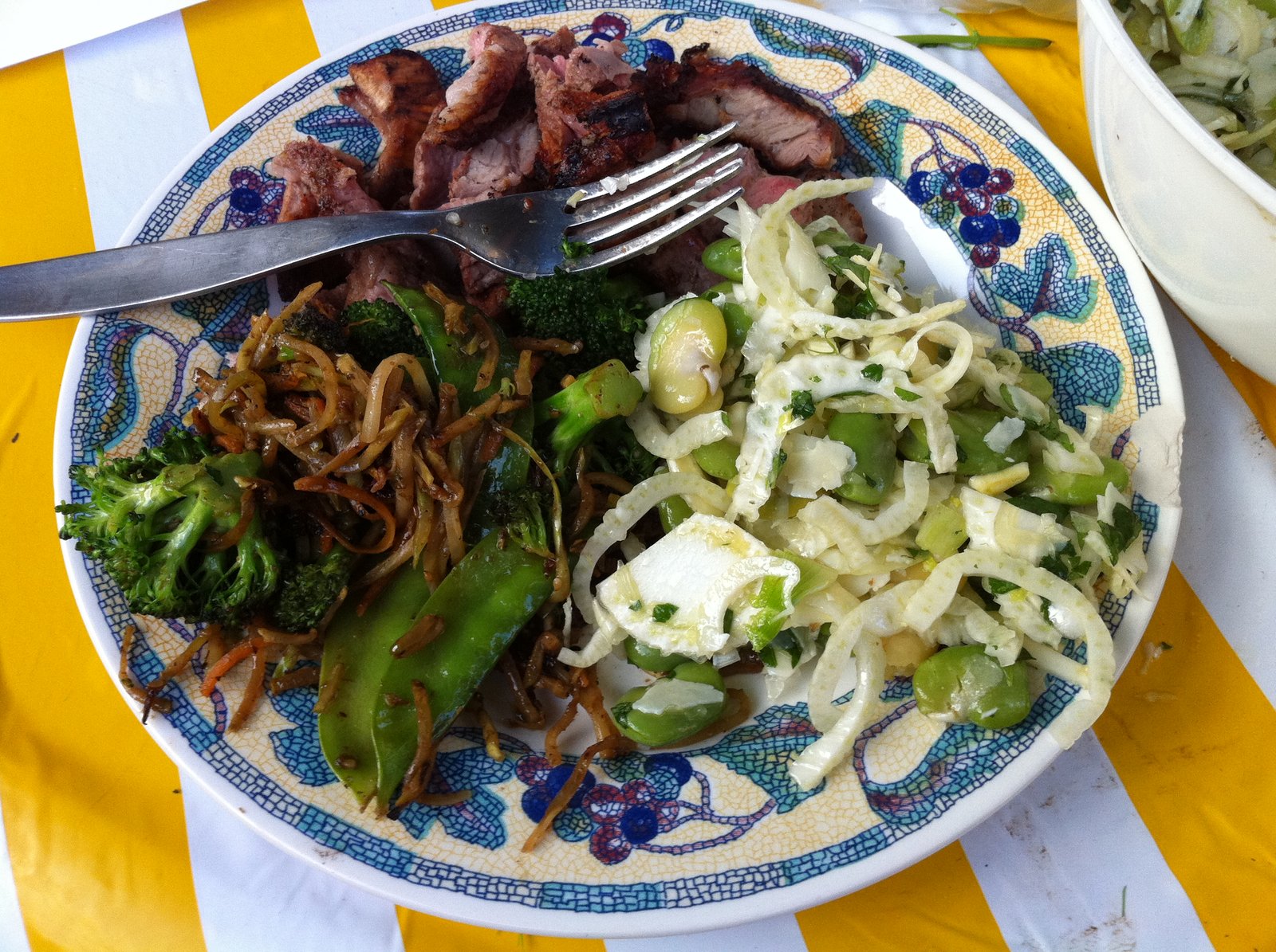 Hi. I haven't posted on my inexpensive meals for a while. This refreshing recipe can be a side dish as well as a main and will cost less than $5. I confess I took the photos for this post when fava beans were 'in season' and really inexpensive (three pounds for $1 at Vine Ripe Market) and fennel was also in season (three for $1 at Vine Ripe). Favas, also known as broadbeans, are ready to eat in mid-spring until early summer. Now, in the heat of summer, when I want to eat this, the herb fennel is 99¢ a head and I buy frozen (not canned) fava beans for this recipe. Sold in one pound boxes for about $3 at Vine Ripe, other Middle Eastern markets and at 99Ranch, the frozen broadbeans are not as 'mushy' as the canned. I've also made this recipe with frozen soy beans (edamame) one time when I was apparently reading-challenged while in the freezer.