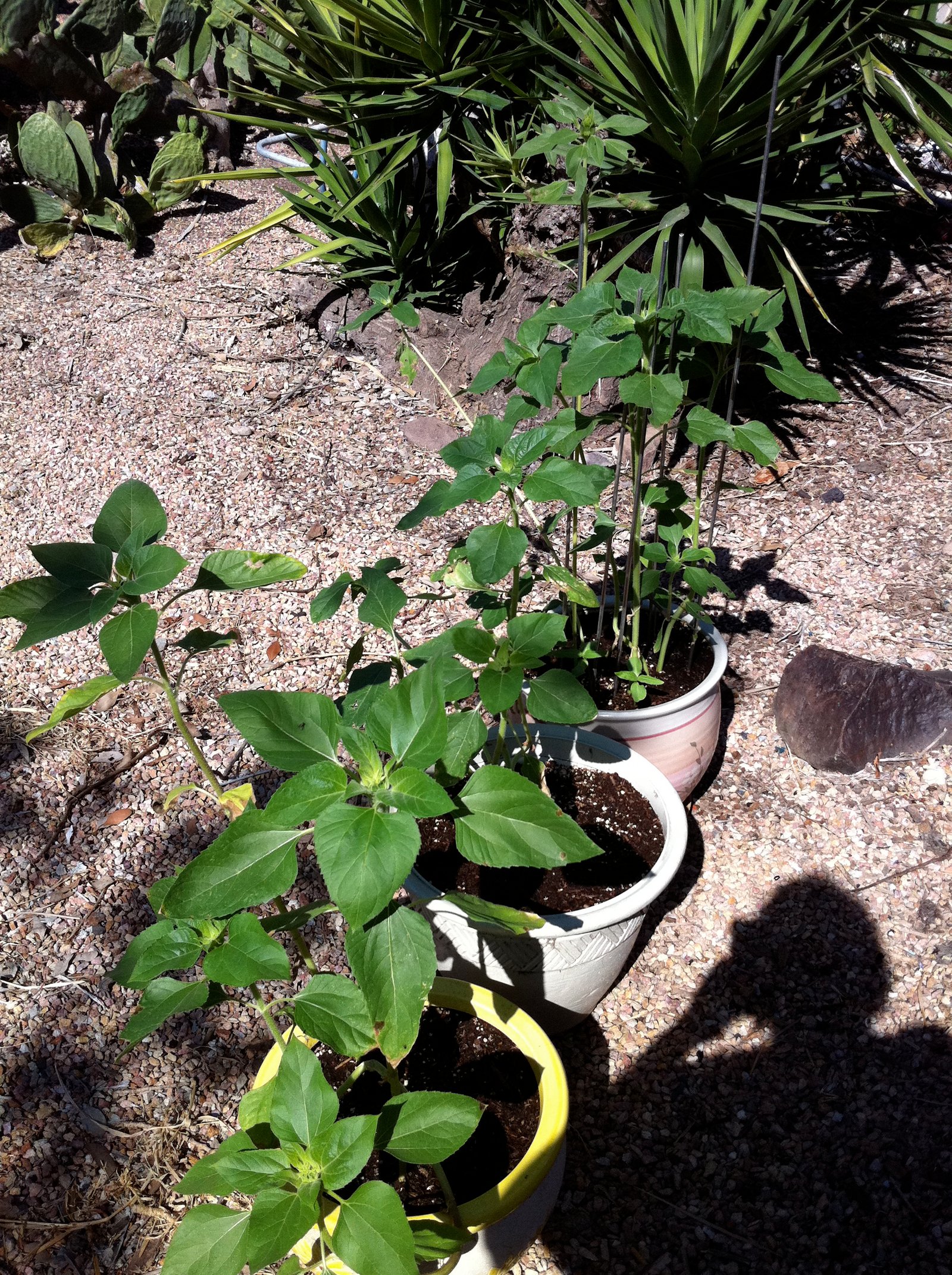 The potted sunflowers are tracking the sun every day and will soon be spread around the yard.