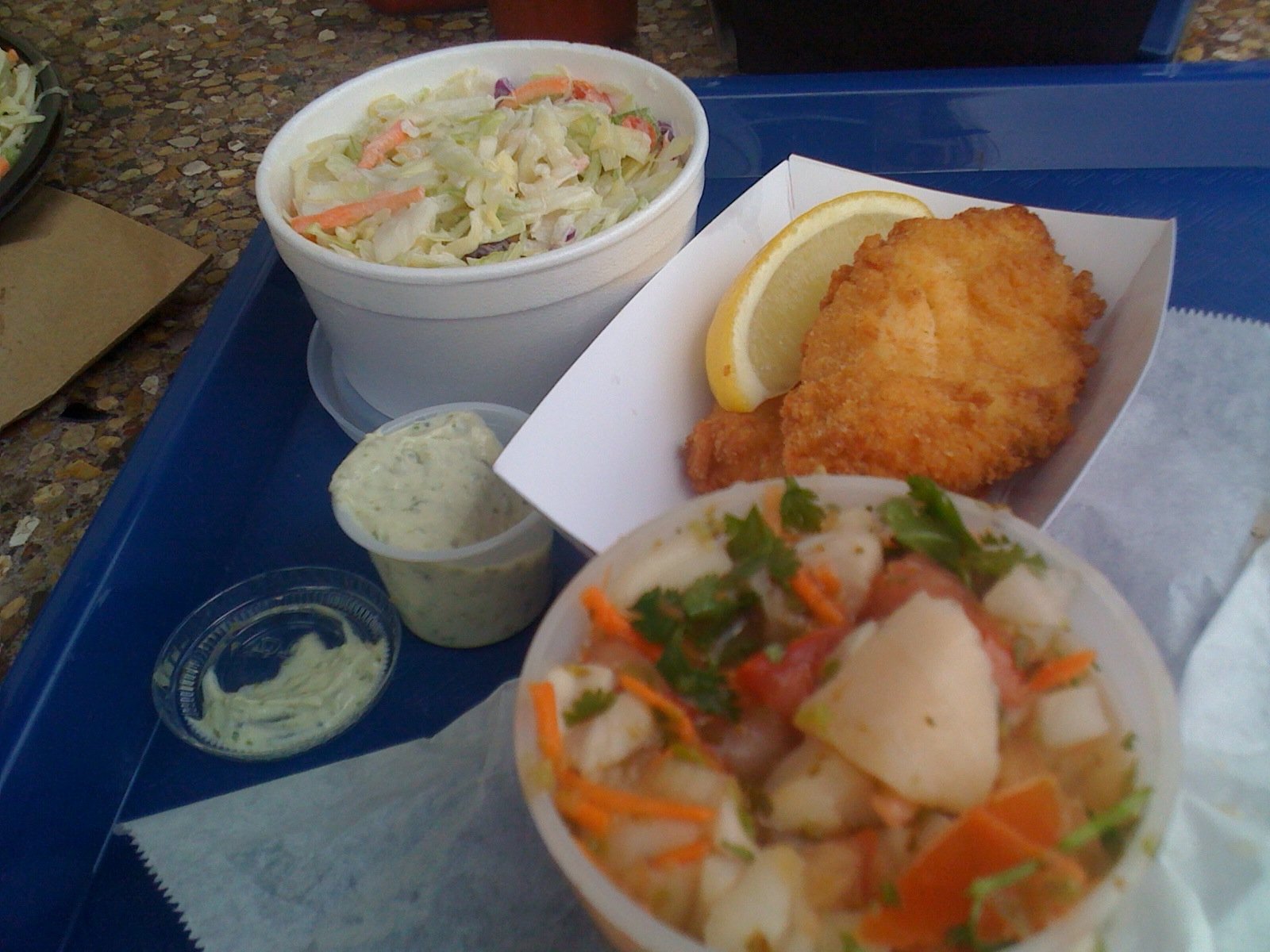 2 pieces fish with cole slaw- you can just order one or two pieces of fish and then a side of slaw for $1.88, part of the 'new' menu I like. The pint of fish ceviche was ordered from the counter: I've never had it from here and think that this day it was not prepared correctly.