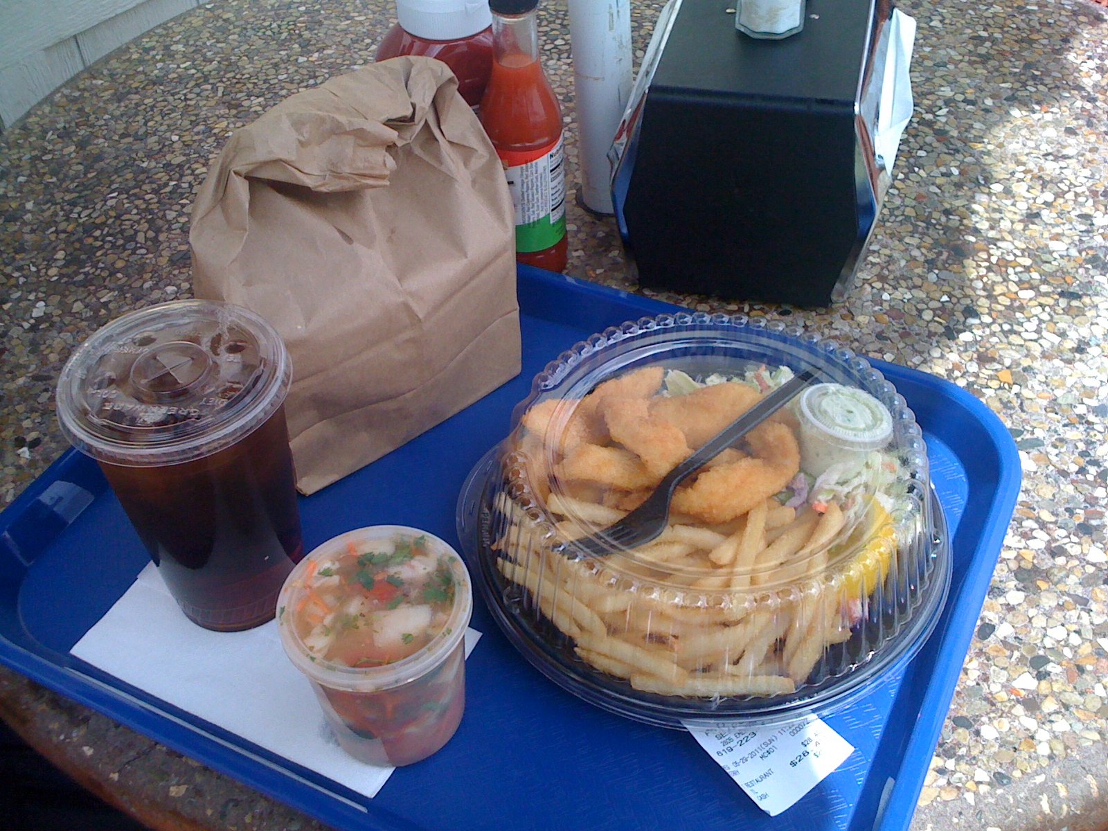 Our meal. (We ordered and paid first, also different.) A large iced coffee, pint of fish ceviche and a squid plate.(total price, including what is in the brown bag, $28.40)