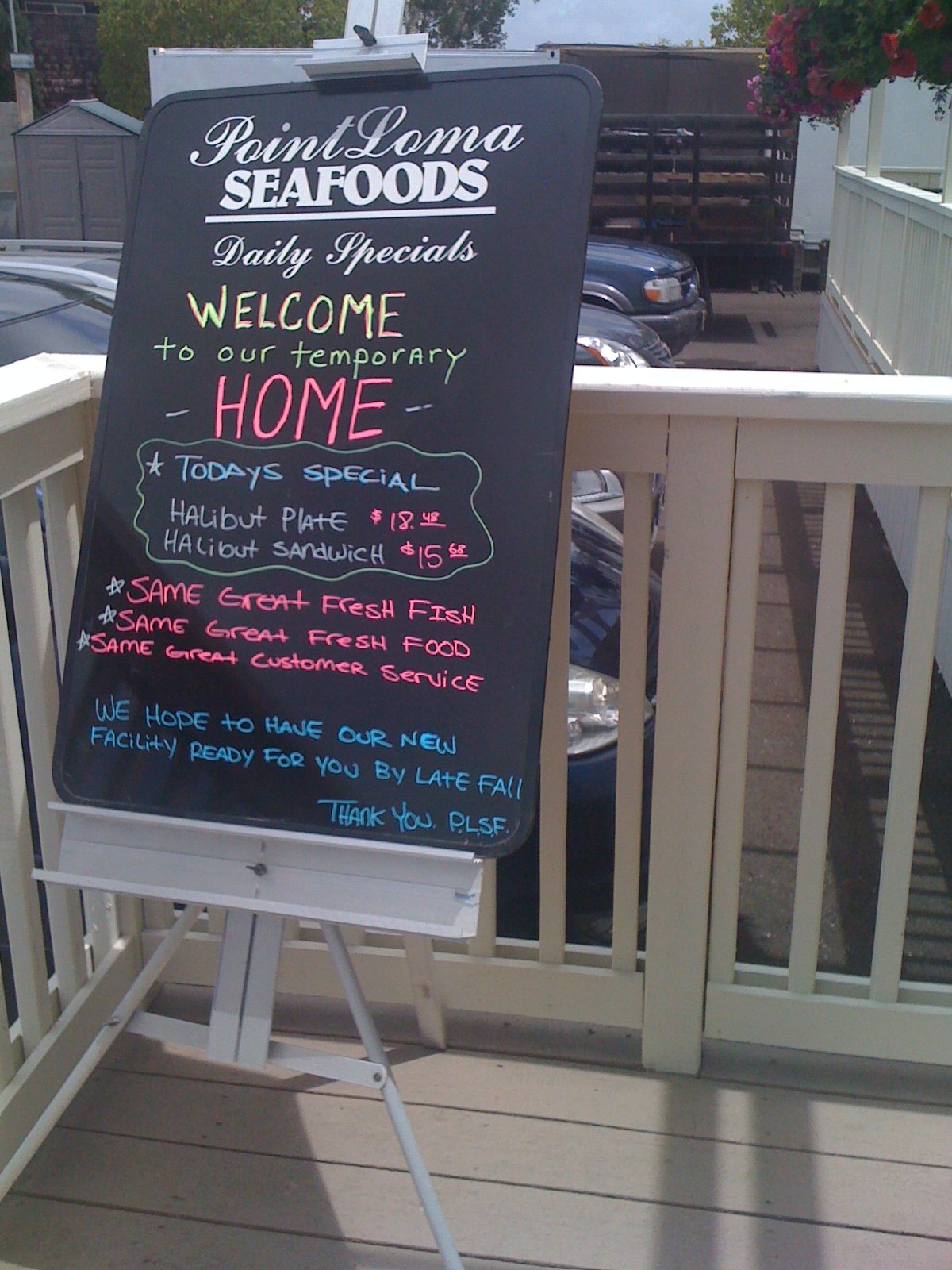 Hi. Point Loma Seafoods, a San Diego institution for more than 40 years, is getting a facelift. I have posted about PLSF two other times. I suppose it is part of our 'rotation'. The building you are used to is gone and being rebuilt. At the far end of the parking lot , what at first appears to be a small trailer exists. This link to the website shows an overlay of the 'new area' right next to the 'old' area.