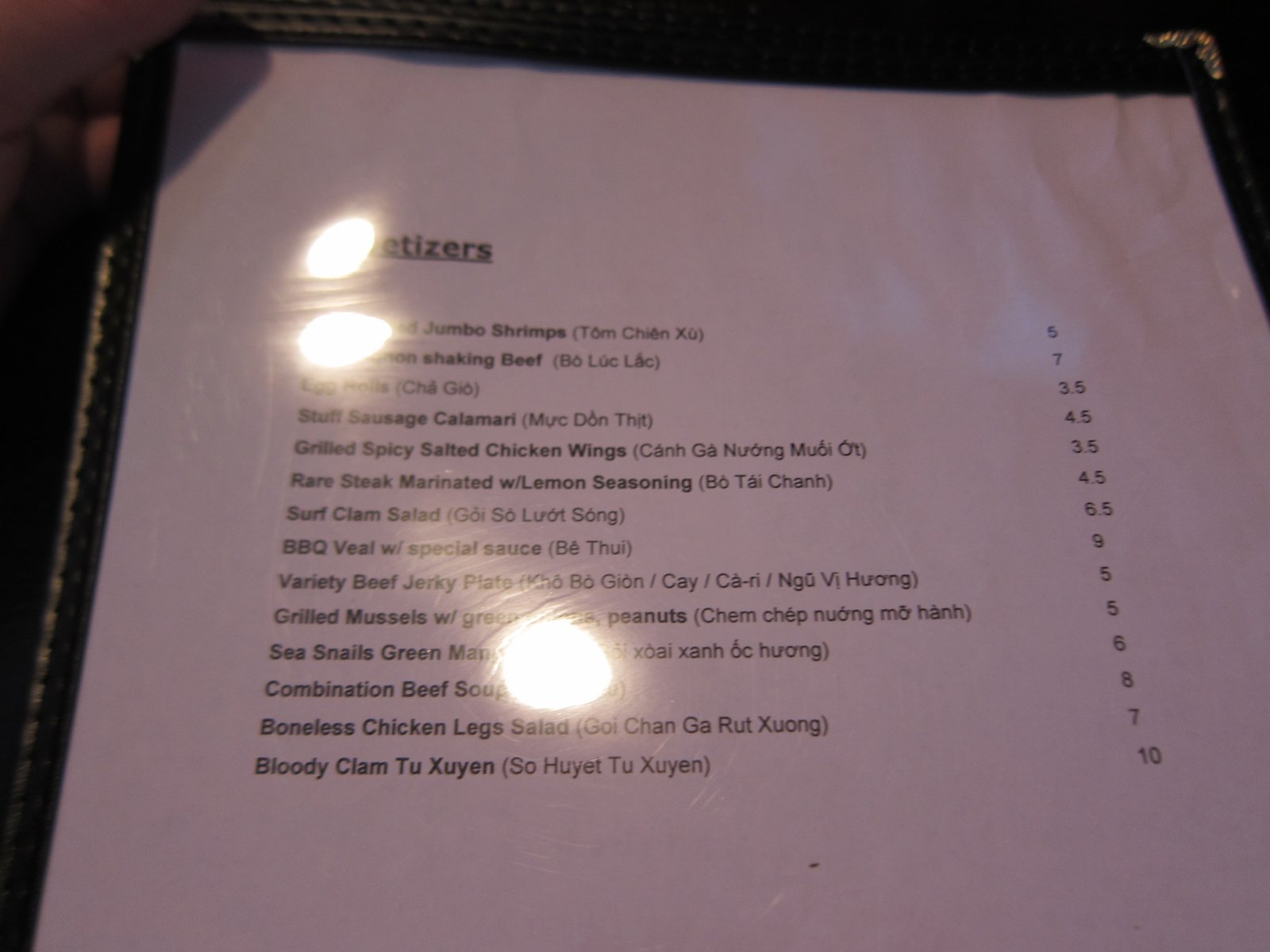 About this time we had our first encounter with the very friendly and gracious Carolyn, whom I believe is one of the owners. She explained that the "appetizer" menu is only available from Thursdays to Saturdays, since she has to go to LA and Orange County to source what she needs. Thus, the menu changes every week, and they run out of items…. So no Muc Don Thit, stuffed squid…bummer.