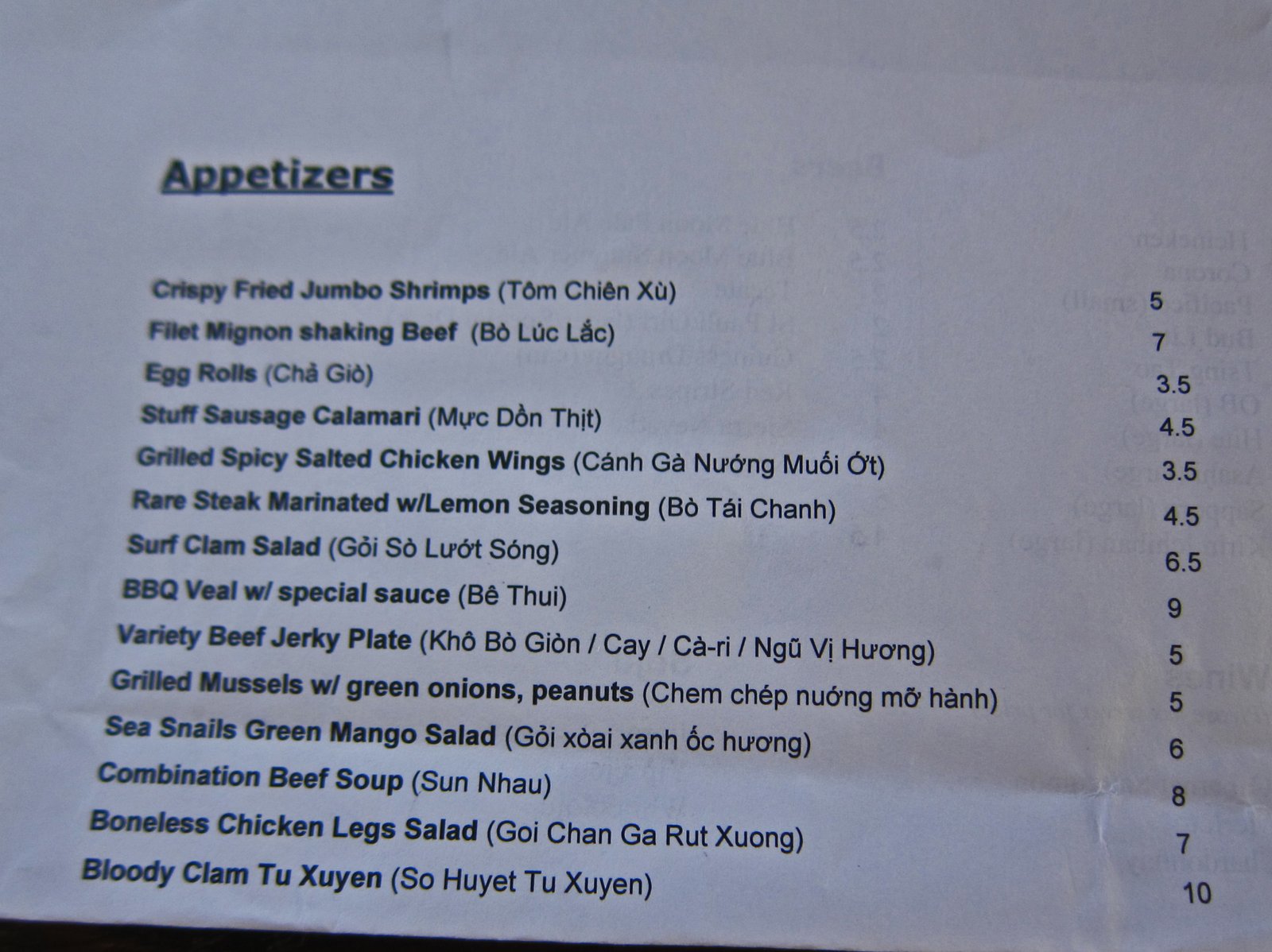 We arrived to fairly empty restaurant and were handed some menus….. I really wasn't looking for Pho, Com Tam, or Com Chien… where the heck was the "good stuff"? And then it arrived, the drinks menu…. but it's not the beer and soju that grabbed my attention, it was this: