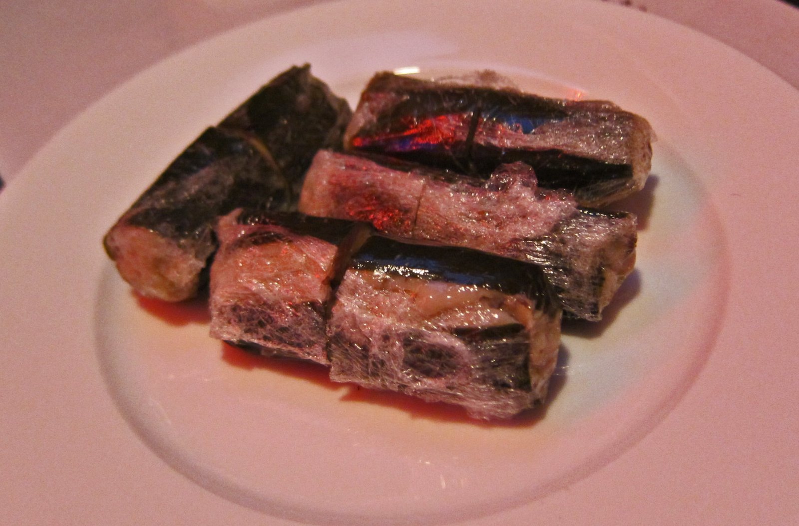 Seeing how much Peter, Ange, and I were enjoying our meal, Carolyn gave us some Oc Cha, some wonderfully flavored snail based "sausage". The snails added a nice toothsome sweetness to go with the smokey flavor of the leaves it was steamed in.