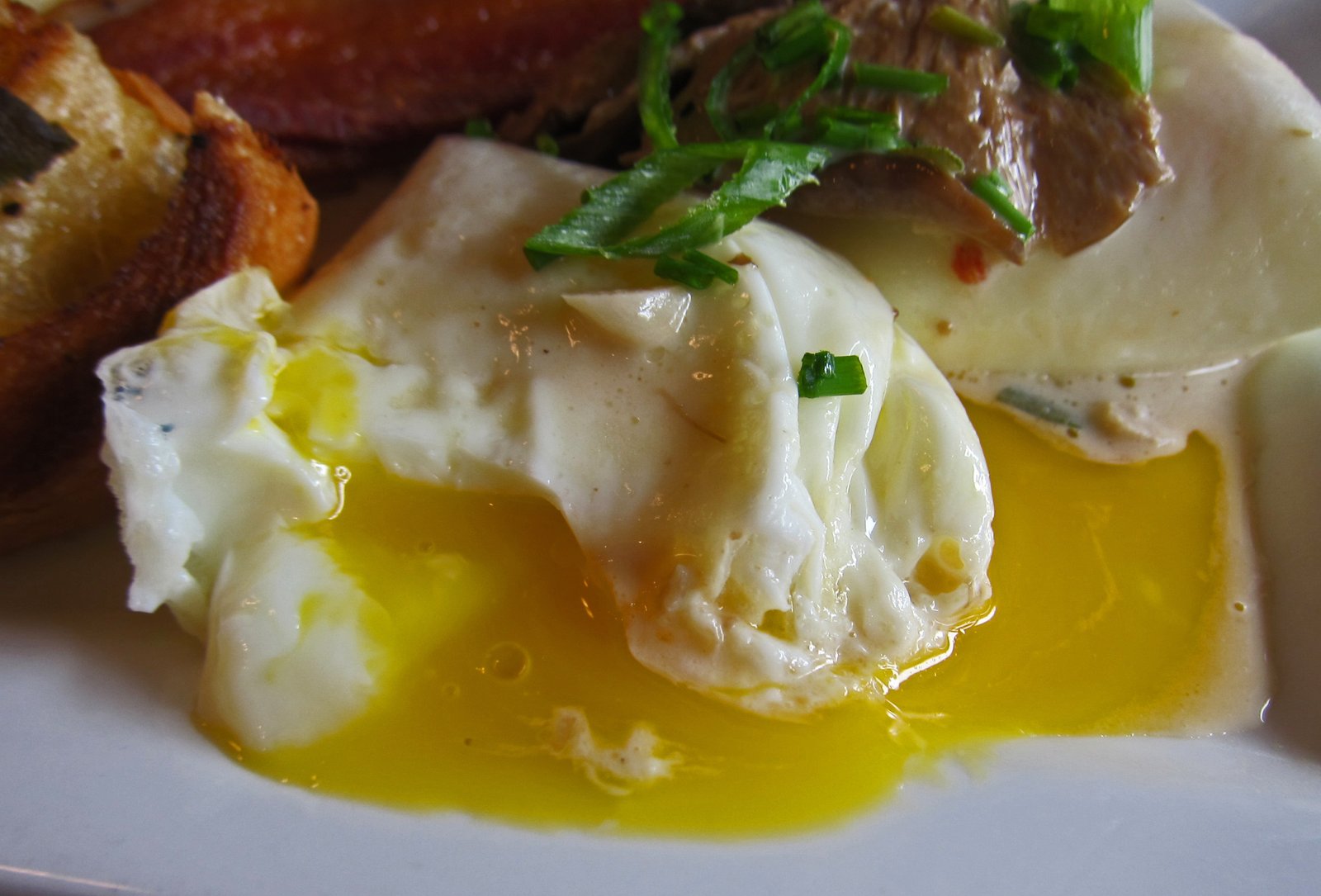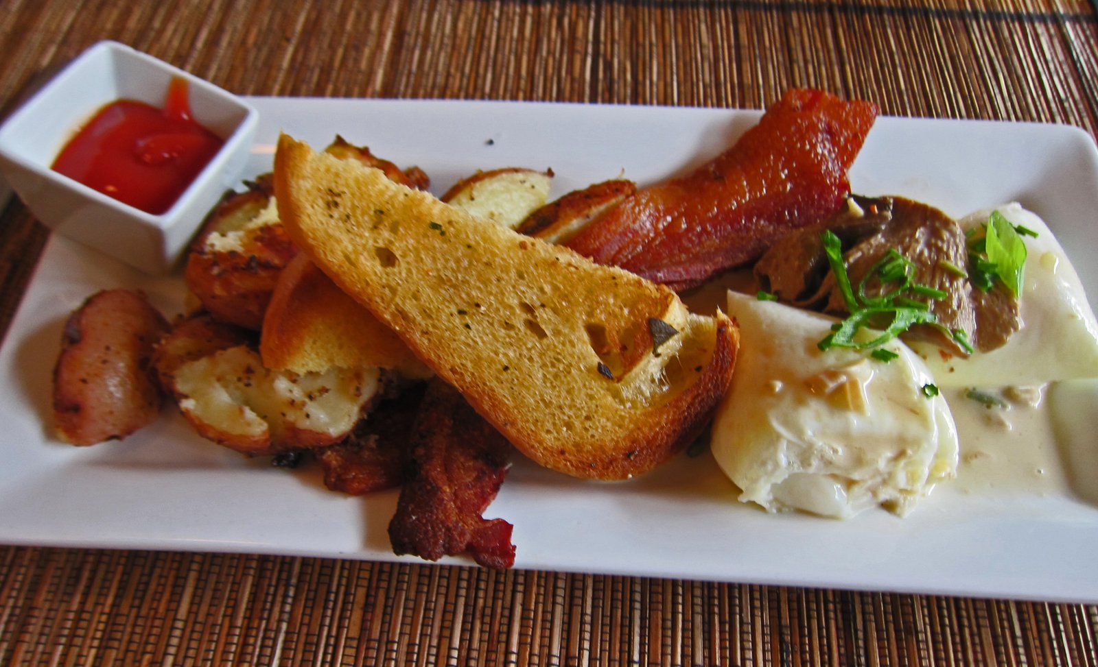 I had the poached eggs with the sage-truffle buerre blanc, applewood smoked bacon, and breakfast potatoes ($11):