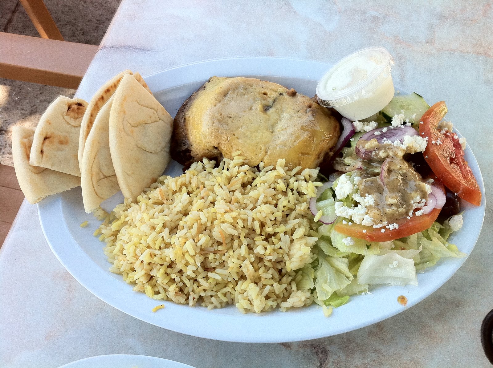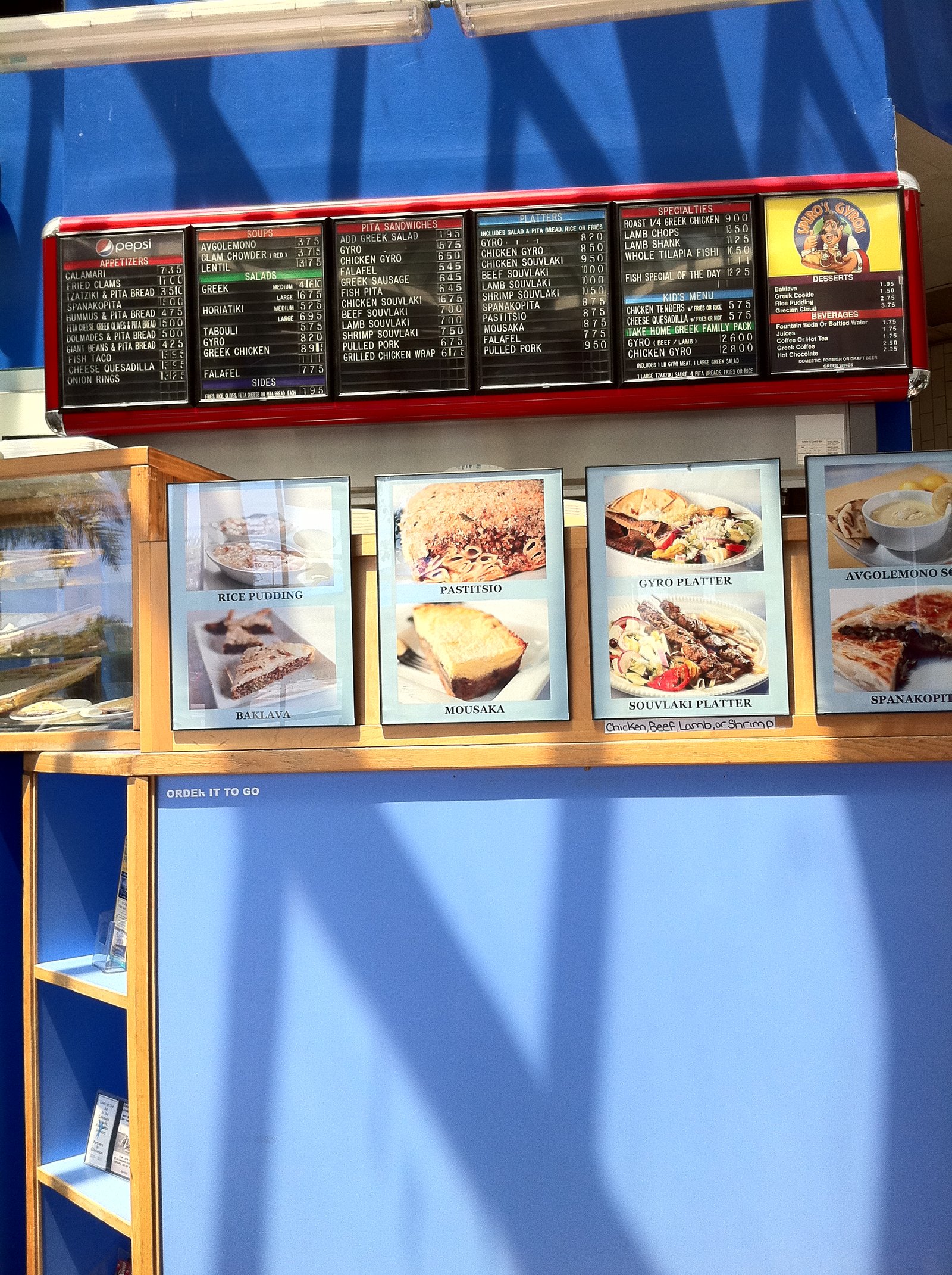 The menu, just behind the cash register, looked better than average in selection and price. Horiatiki salad, as well as appetizers of Feta, hummus, giant beans, olives and pita, Pastitsio as well as chicken, lamb and fish dishes. Then again, the fish taco, quesedilla and pulled pork offerings were a bit out of line with the running theme…