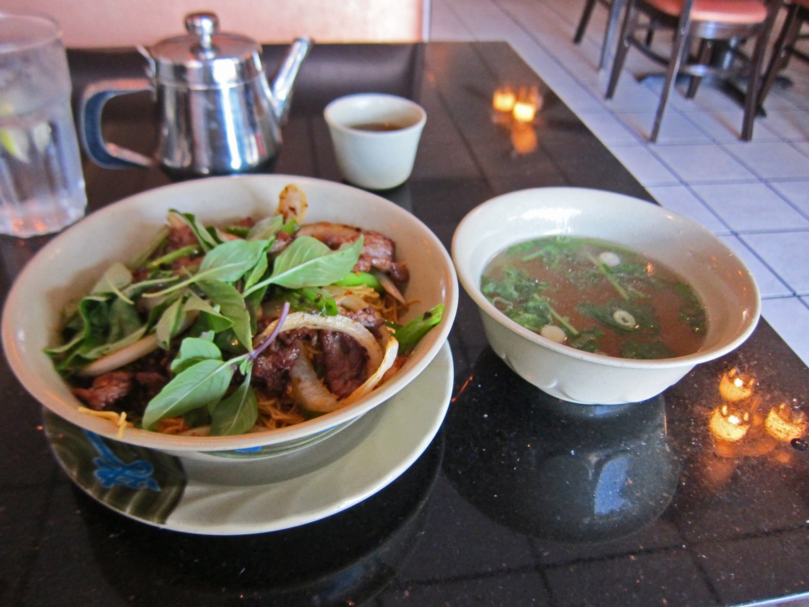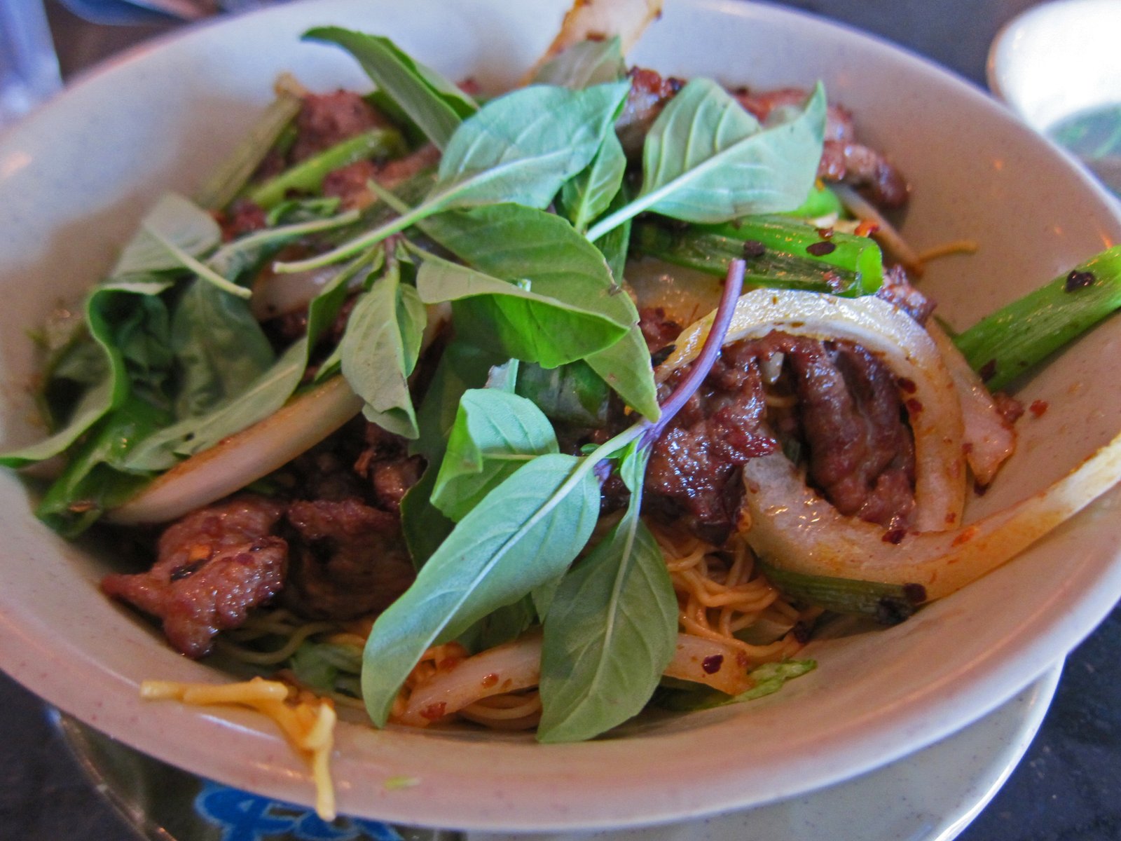 I'd had the Beed Sate Noodle Soup at LHK before, an underwhelming experience, but felt that I should have it dry (Kho) just to see. This was an error on my part. Other than a mild spiciness the flavor fell flat…there was so little of that savory sate flavor going on, the meat was on the tough side….too much Thai basil killed everything else…. I ended up removing it. Some tomatoes and more onions replacing all that iceberg lettuce would have been nice as well.
