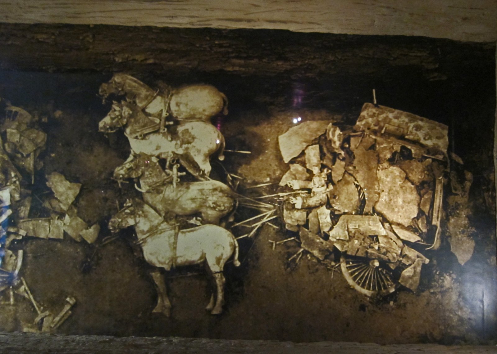 We started our visit in the museum to the right of the entrance. The most interesting item was a replica of the bronze horses and chariot found near Qin Shi Huang's tomb(about 2 km west of Terracotta Army), along with photos of how it looked at the time of discovery.