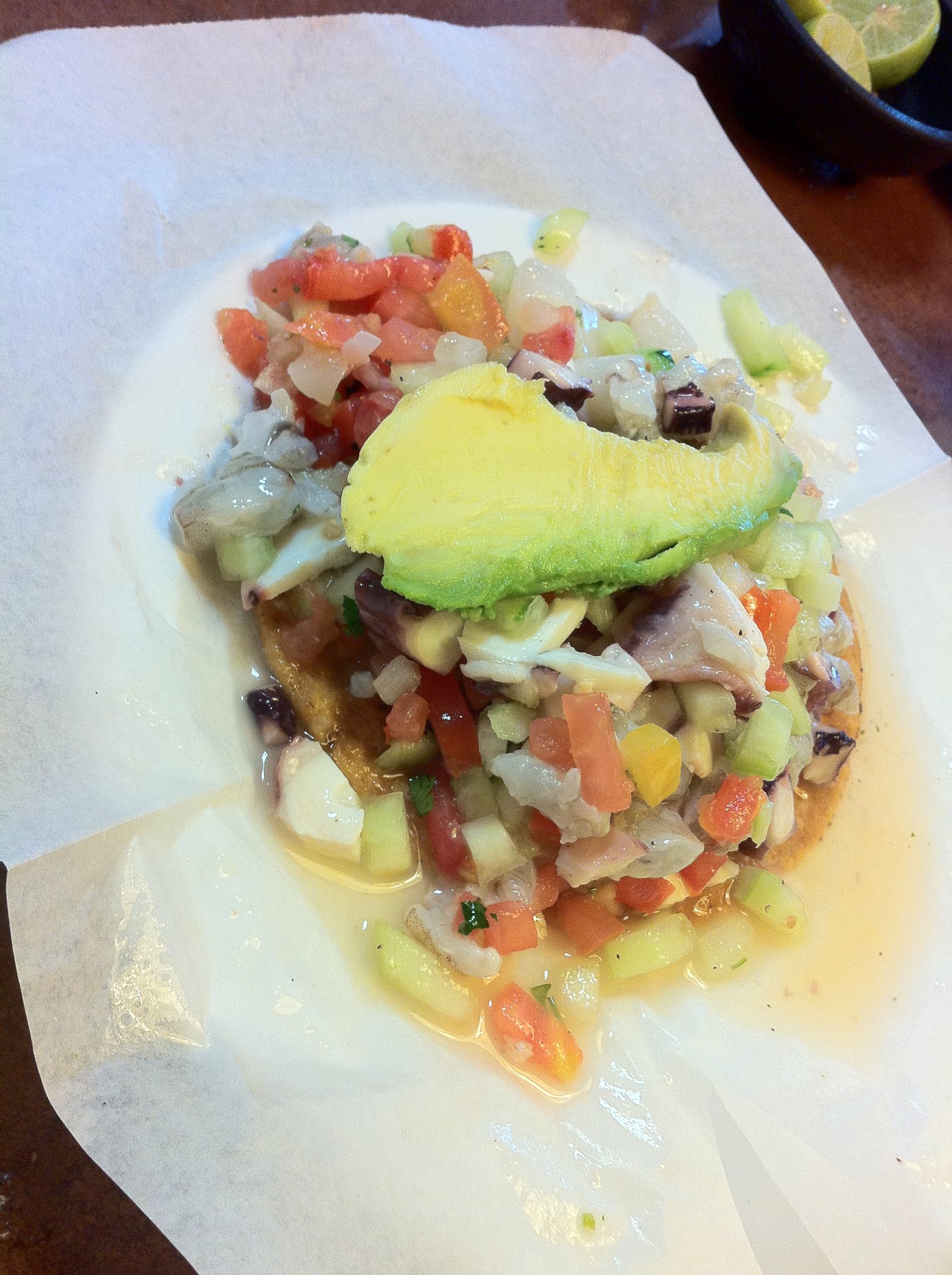The Mister saw a calamari tostada on the menu for only $1.95, so he ordered it for us to share. This was not your typical squid. First, this must have been a very large squid since the pieces had a good diameter. The meat was tender and meaty. It was sauteed, cooked in a salsa which made it tender…almost stew-like. It was very good and I'll order it again.