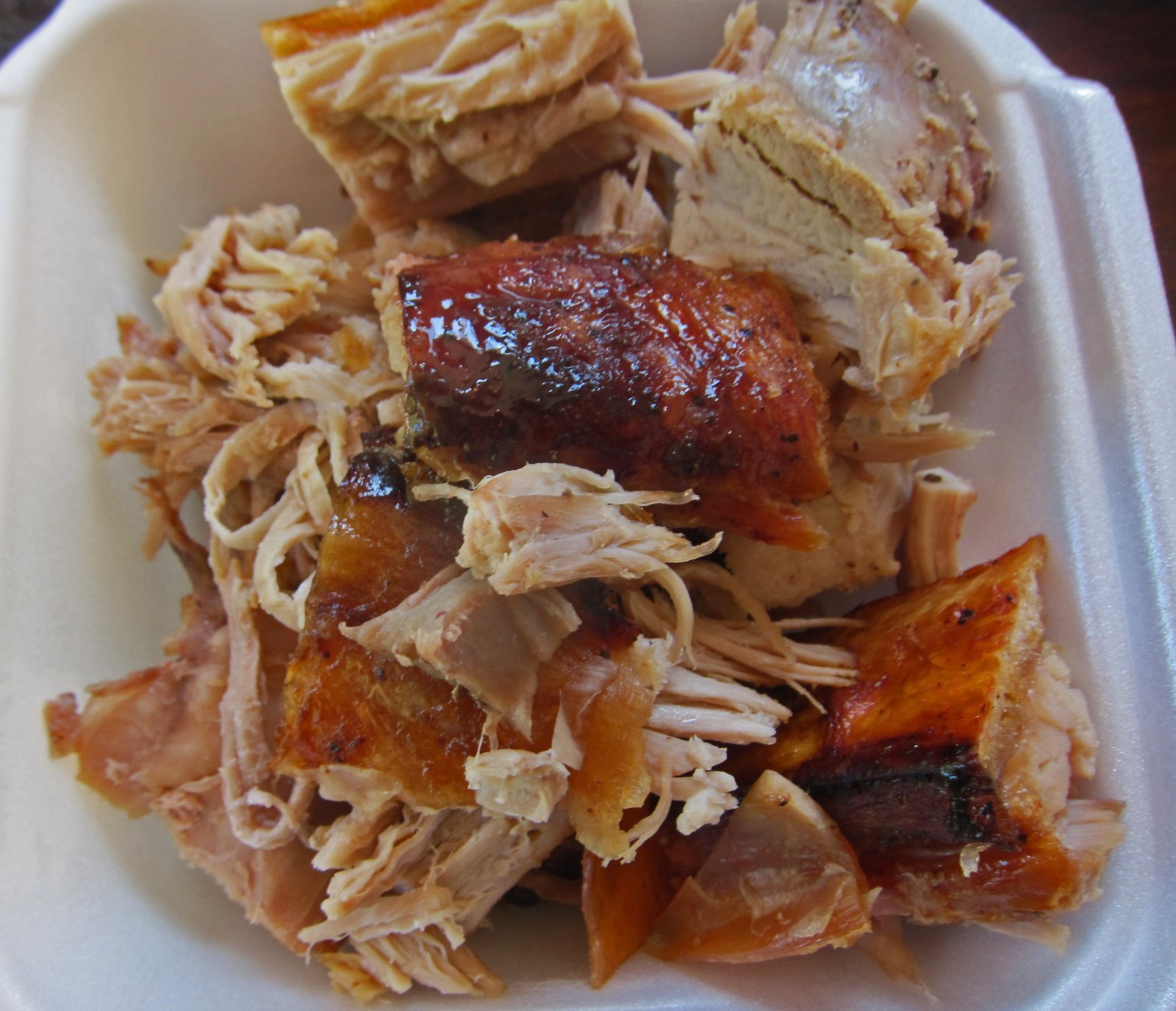 Still, noticing that they sold lechon by the pound ($10/lb), courtesy of our friend pictured above and had two types of sisig in trays…actually there's mention of a third, bangus (milkfish) sisig, but I didn't see it on my visit. Well, I thought I'd hit the promised land and ended up buying a pretty good amount of food starting with a half pound of the lechon.