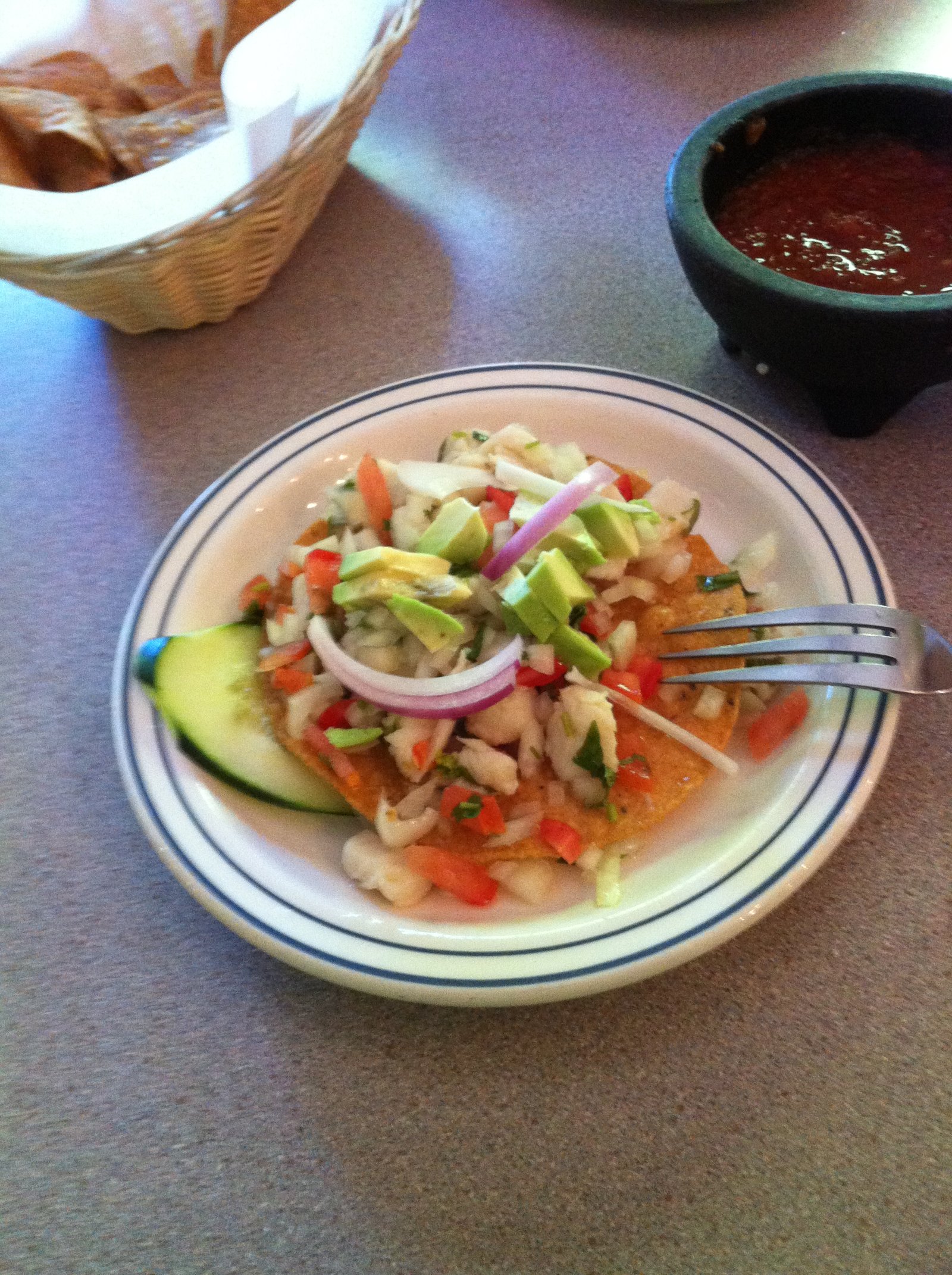 We decided to try a fish ceviche tostada ($2.25) as an appetizer. Really, really nice. The fish was fresh, flaky, tasty and the lime juice, tomatoes, onion and cilantro were complimentary and not overwhelming. The tostada was placed on top of lettuce and that cucumber slice, so it didn't get soggy.