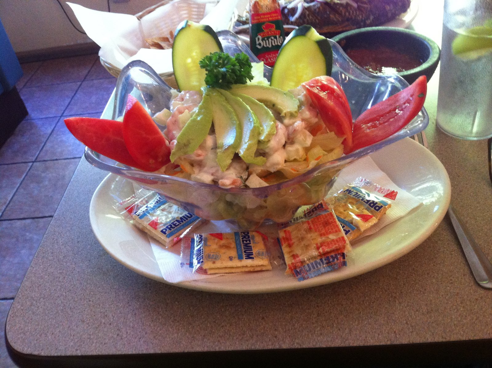 After a long discussion with myself, I had decided on the camarones (shrimp) salad because of the description. Plain (home made) mayonnaise was the dressing and it complimented the very large (in size and number-24) shrimp. Lettuce, shredded carrot and chopped cucumber were the only salad ingredients. The topping of avocado, two slices of cucumber and the tomato added enough variety so that I could enjoy those shrimp in the dressing. This was filling, refreshing and worth the lunch price ($8.95).