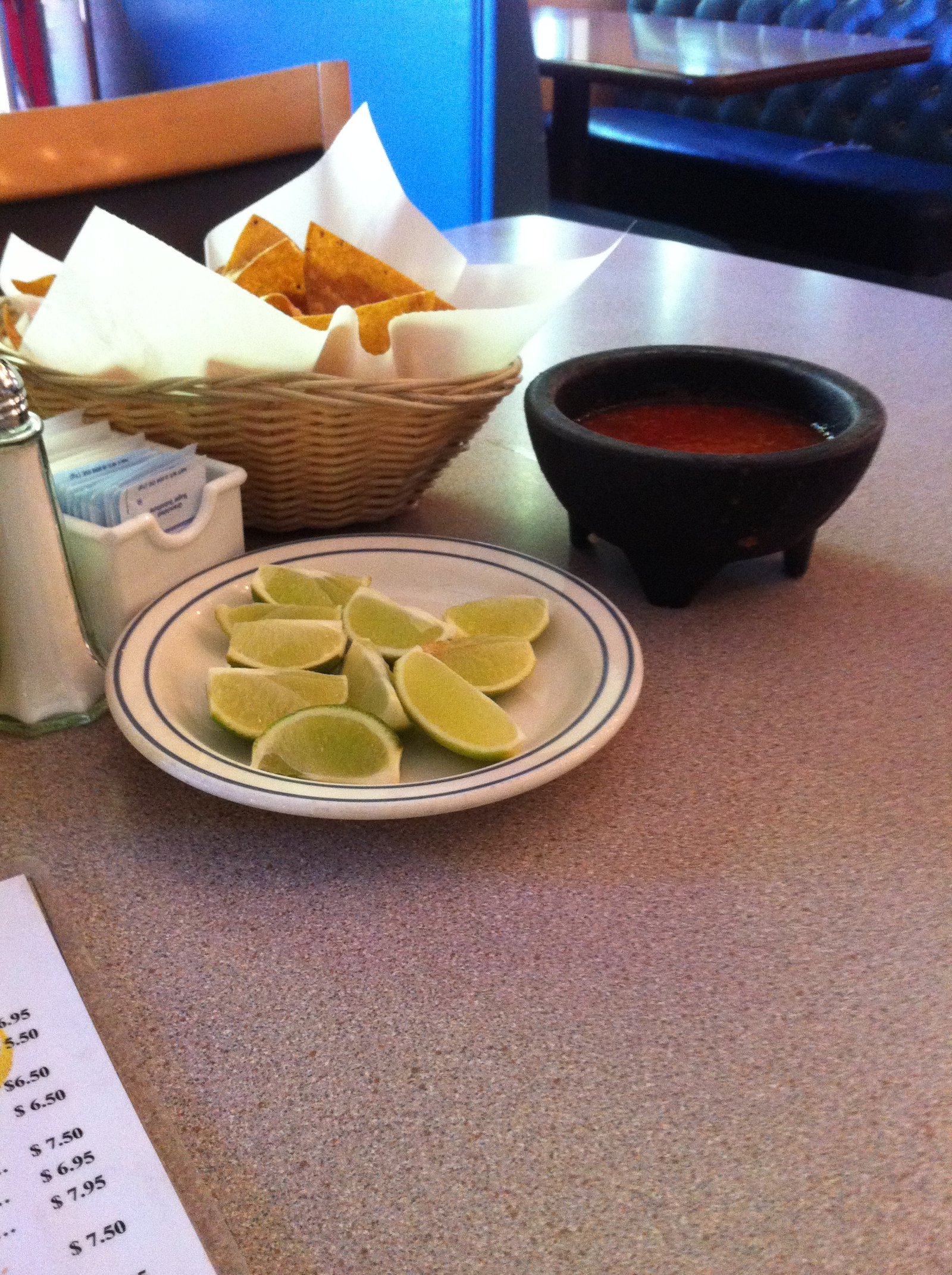 Lime wedges, fresh (light and very good) corn chips and a mildly hot salsa were brought to the table (after ordering, a group of appropriate hot sauces were brought out, however, I used this salsa for everything- no vinegar or sugar and a good heat to it).