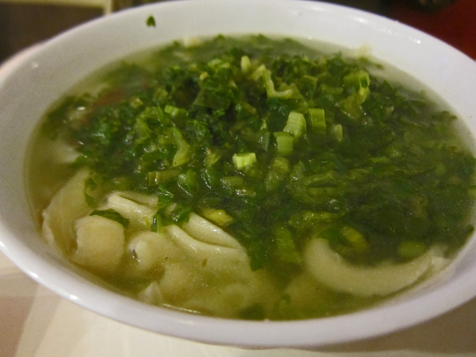 The Missus isn’t really eating much red or even white meat nowadays and asked the woman for a vegetable noodle soup…..the noodles here are Dao Xiao Mian – knife shaved noodles. Dough is rolled out, folded then sliced with a sharp knife. Originally a Shanxi specialty, we saw more than few little shops selling these during our trip to China.