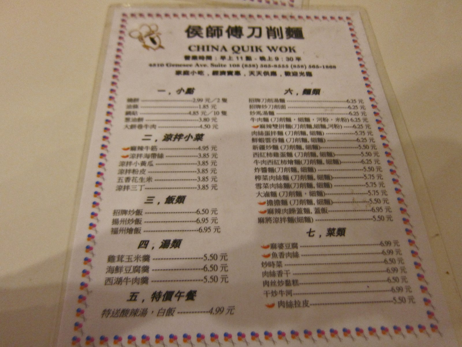 There are seven tables in the joint, bare walls, this is no “concept – theme restaurant”, one menu has all the standard Chinese fast-food stuff on it, the other is in Chinese. Everything from Shaobing to Niu Rou Juan (beef roll), it’s all the of what we call the “Chinese student’s favorites”. Nothing over $6.99 on the menu. The Missus placed our order and I managed to ask the nice woman working how long they’ve been here. She told me that they moved down from Rancho Bernardo in March. Rancho Bernardo? Then it hit me, the folks here have, or had some connection with Quik Wok in RB, hence the name. Funny thing is, I’ve been to Nazca Grill at least four times since March…..slap to the forehead!!!