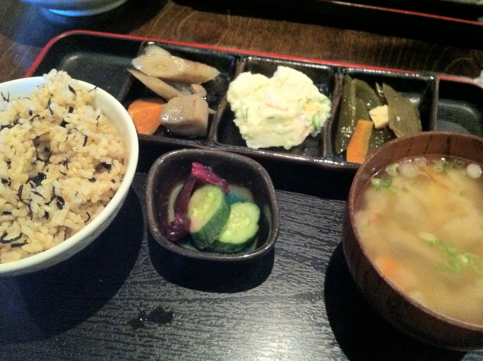 The lunch menu consists of ordering a "set" ($6.50). This is what our recent one looked like-(from 5:00, going clockwise) a vegetable filled miso soup, pickled cucumber and radish, rice with seaweed and a tray of small 'tapas'-nishime, a potato salad and chilled stewed vegetable.