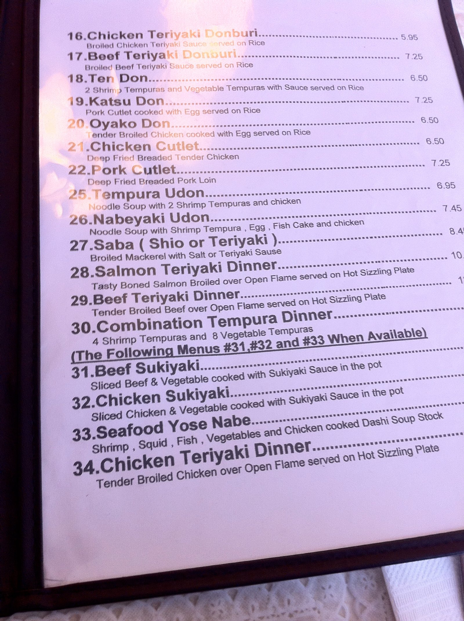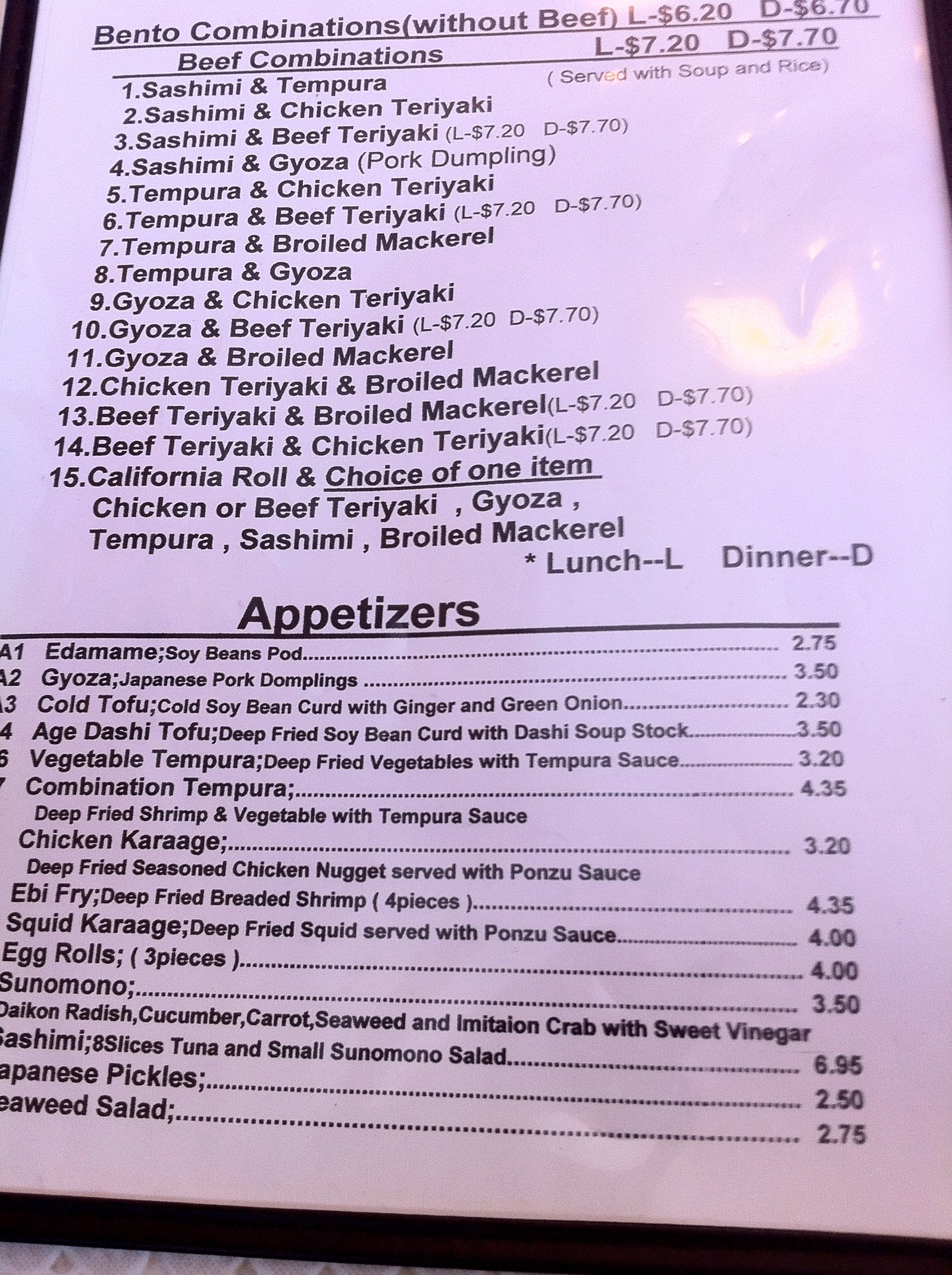 The teriyaki chicken broiled mackerel plate is still $6.20. The Mister always orders one of the mackerel plates. The mackerel is particularly good tasting large piece of fish, broiled and placed on top of shredded cabbage so the bottom stays crispy and doesn't get soft when the juice flows from the cooked meaty mackerel. The teriyaki sauce on the grilled chicken is not too sweet and made here (not from a bottle). The chicken is placed on top of bean sprouts, again so the meat does not wallow in sauce. A lettuce salad, cold noodle salad and three freshly steamed edamame beans round out the plate.