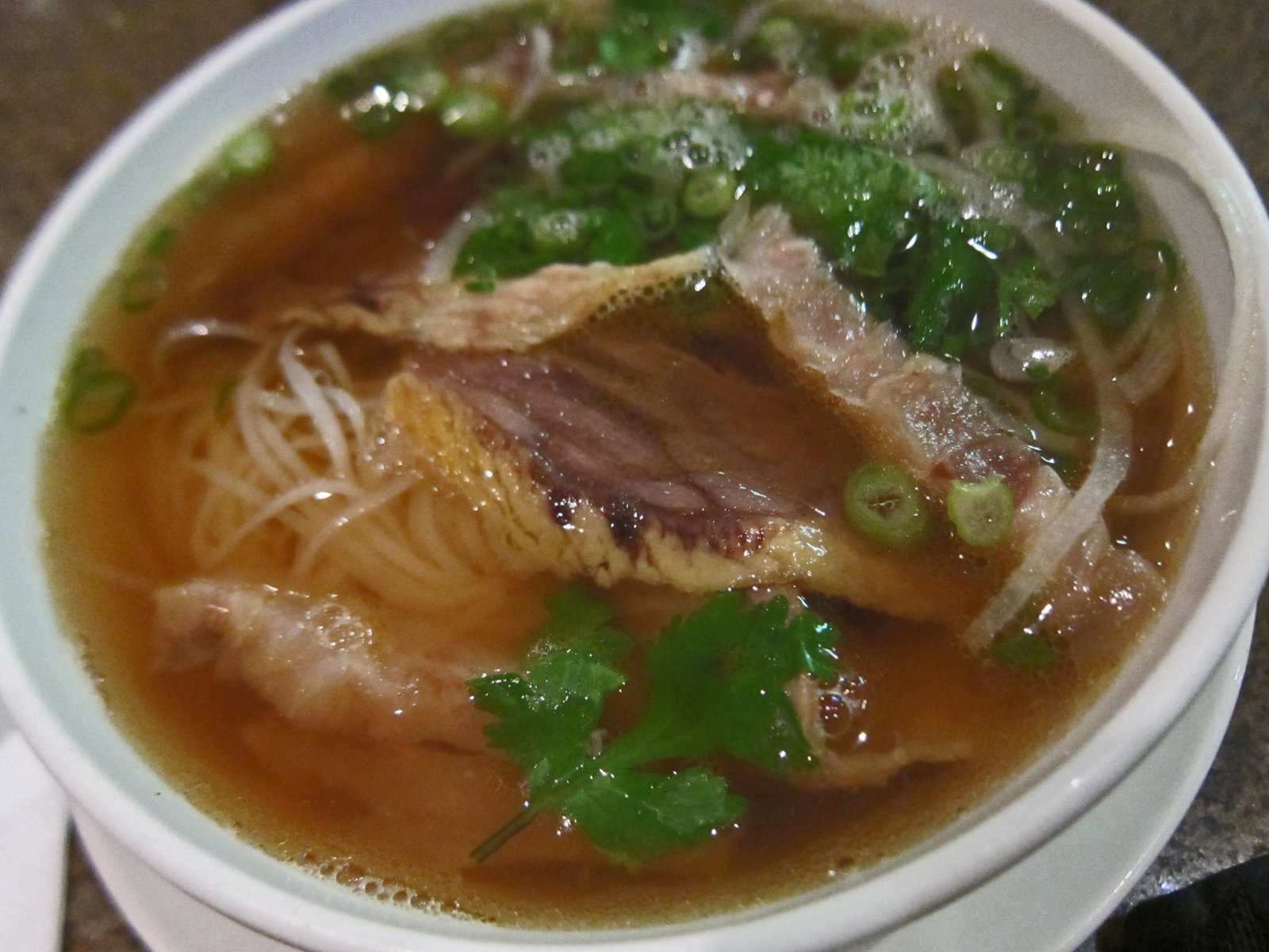 I ordered a bowl with just tendon, brisket, and flank. The broth was on the dark side but very soothing and not too salty. Nice mild anise and onion tones. Noodles could have used less cooking time but I wasn't complaining. To my surprise (and to the really funny Server's) the Missus ordered a large Dac Biet (Special) and plowed through most of it (left the rare steak).