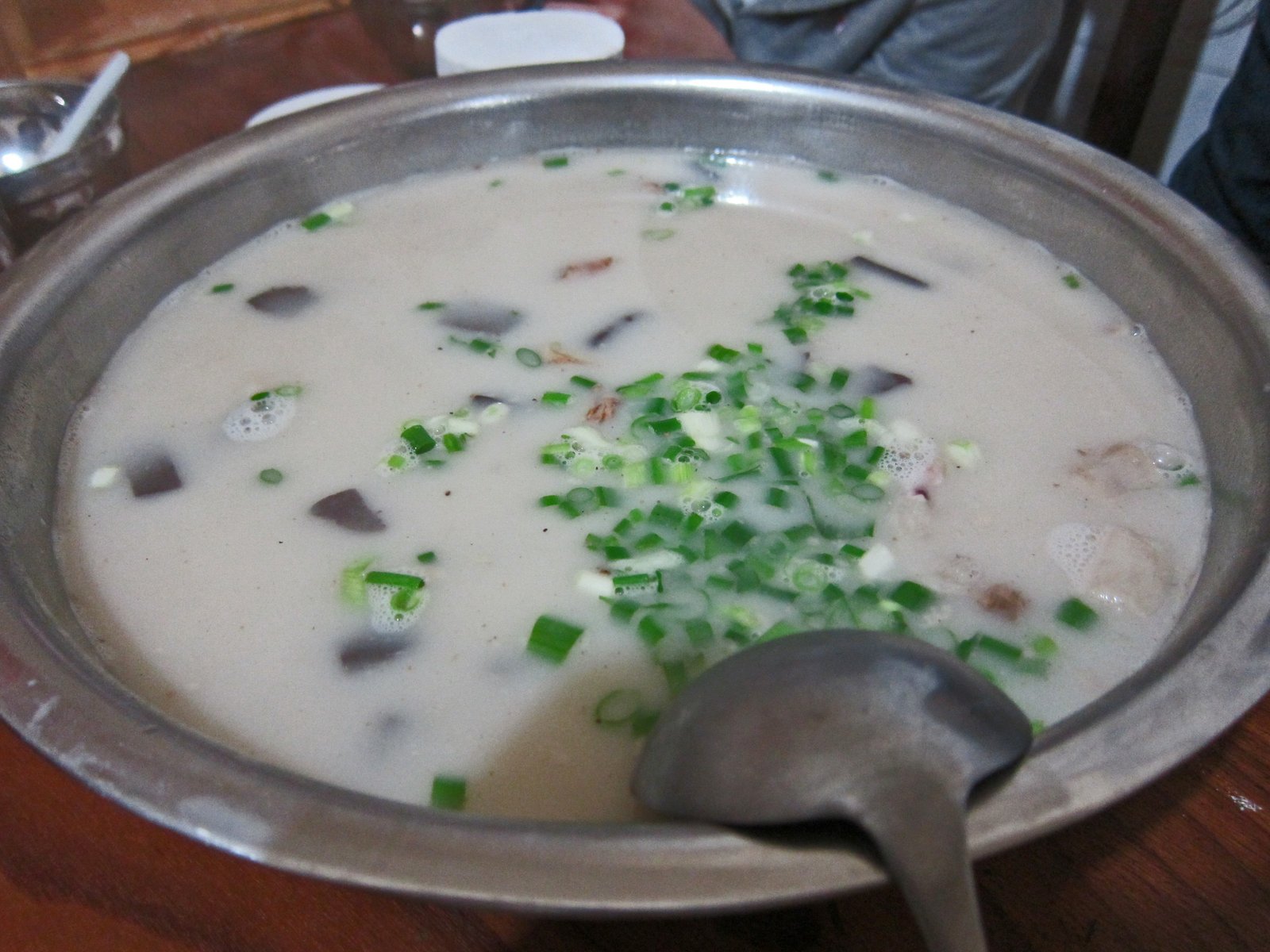 The broth of the mutton soup seems to made from rapidly boiled bones, creating a milky white appearance, a process that leaches all of the nutrients from the bones. When the Missus used to get sick as a child, Her parents used to make bone soup to nurse Her back to health, so it is something appreciates.