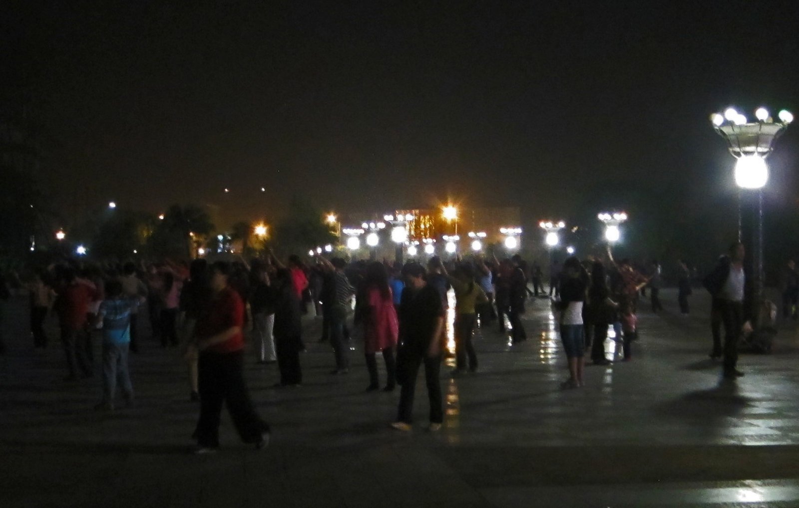 But much like the rest of China, after the work days ends, the park is full of people getting their exercise, watching a movie on the big screen over the park, dancing, or just plain socializing.