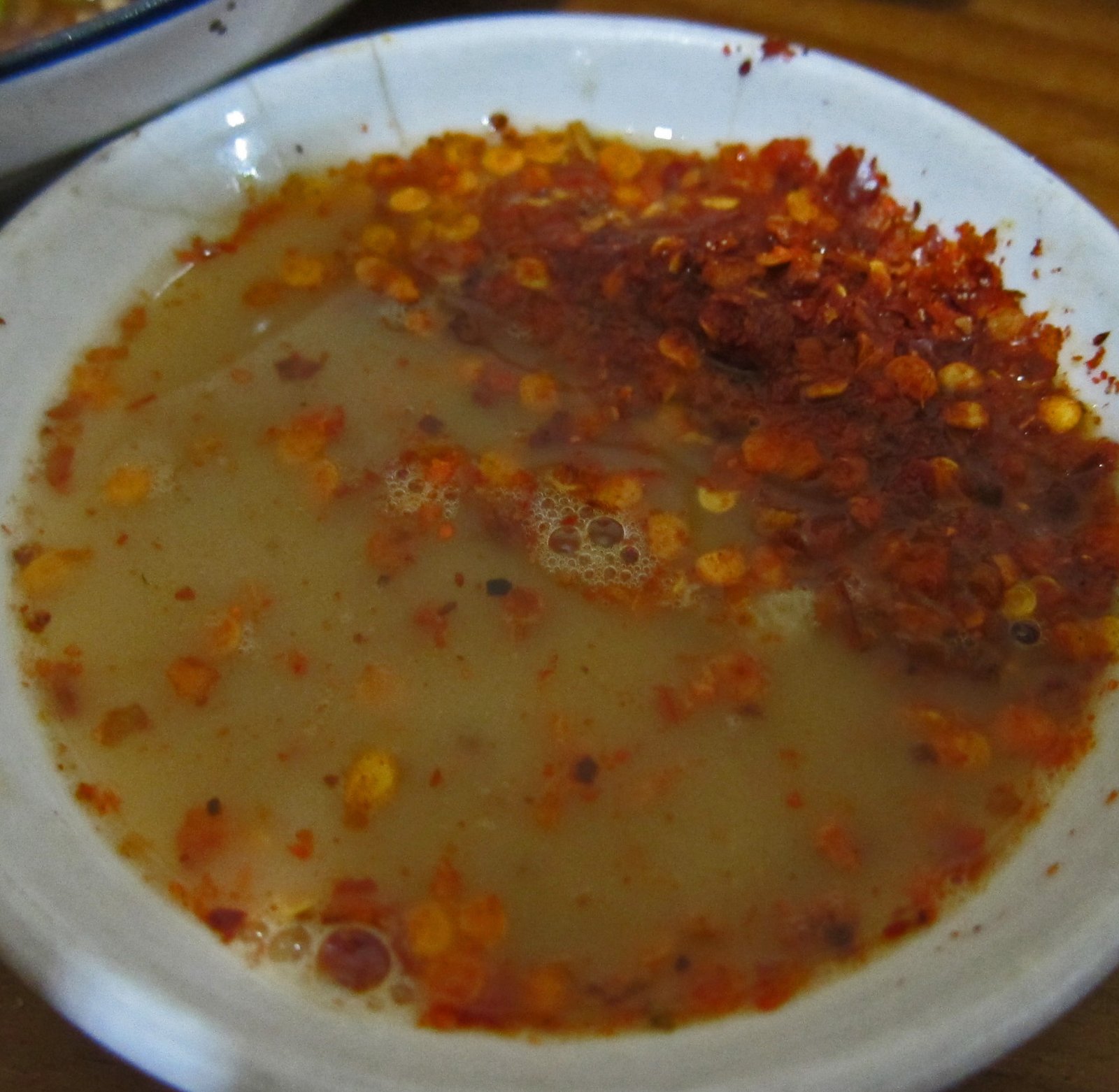 There were a few side dishes ordered and it seemed like there were two standard condiments for the dish that came out. The first was simply salt and ground chilies. The second was lamb consomme with chilies.