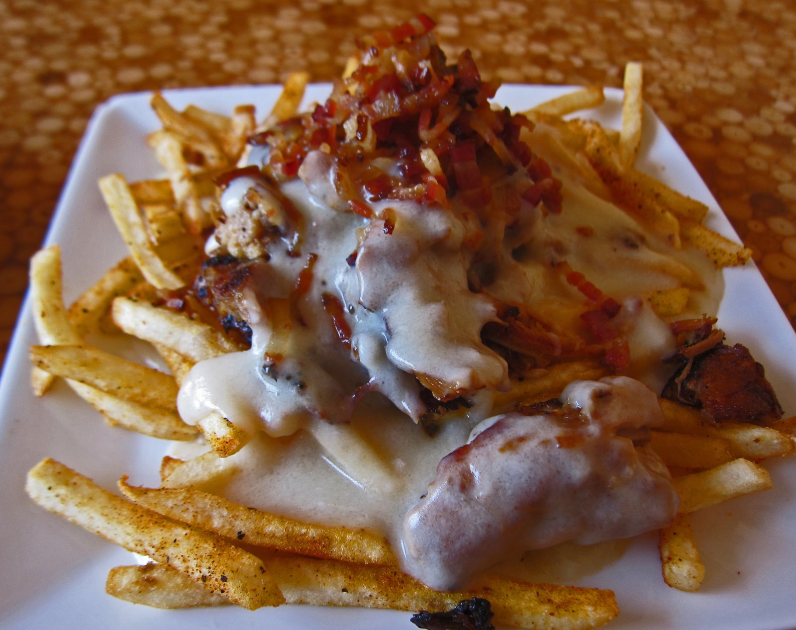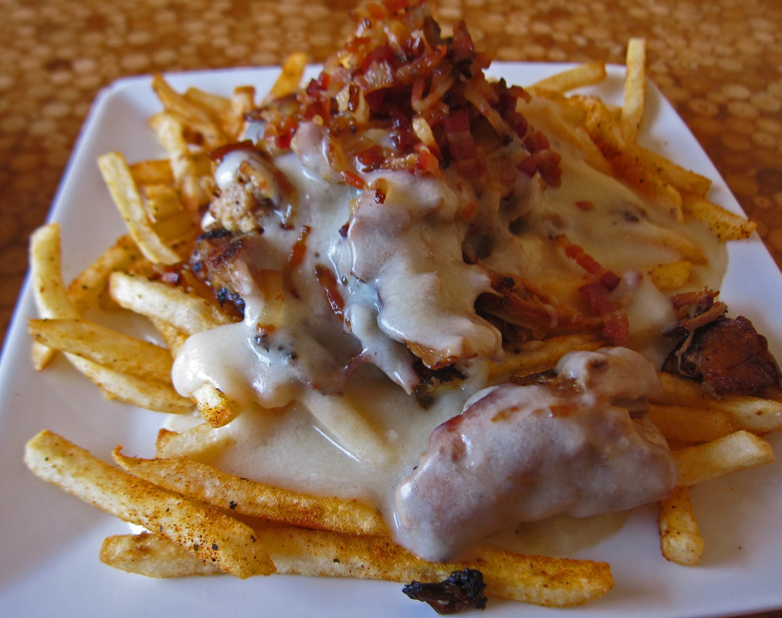 For me, this was a case of the parts being much more tasty than the sum. The pulled pork itself was very tender with a mild smoke flavor that is completely overwhelmed by the cheese in the sauce…which had attained a glue like texture by the time it hit the table. The fries were nice, but the seasoning just added more interference to the dish and combined with the cheese in the gravy made this pretty salty as a whole. Having bacon just made this a bit too over the top for me…..