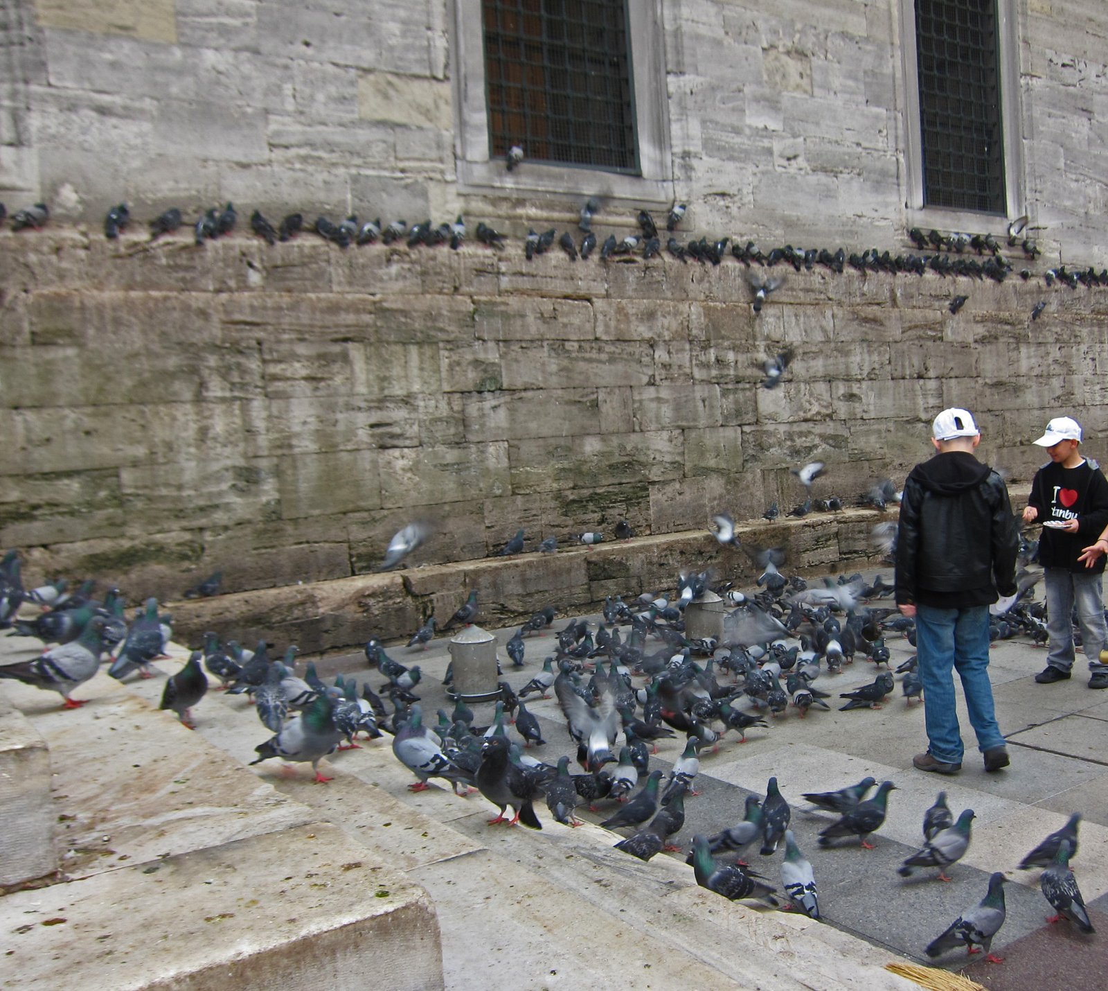 There are women selling bird seed to feed the thousands of pigeons that flock around the mosque.