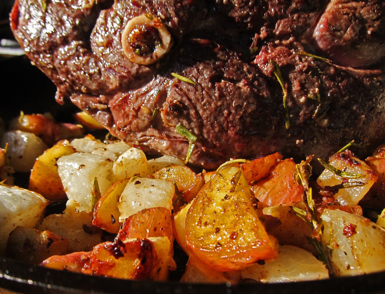 Not wanting too much, I bought half a leg fro Seisel's, though in retrospect I should have gone to one of the many Halal markets in the greater San Diego area to pick this up. I rubbed the lamb with a paste of garlic, salt, pepper, rosemary, and thyme. Same with the potatoes….I also threw in some leftover daikon as well. I decided to roast everything in my cast iron pan letting the fat from the lamb render off onto the root veggies.