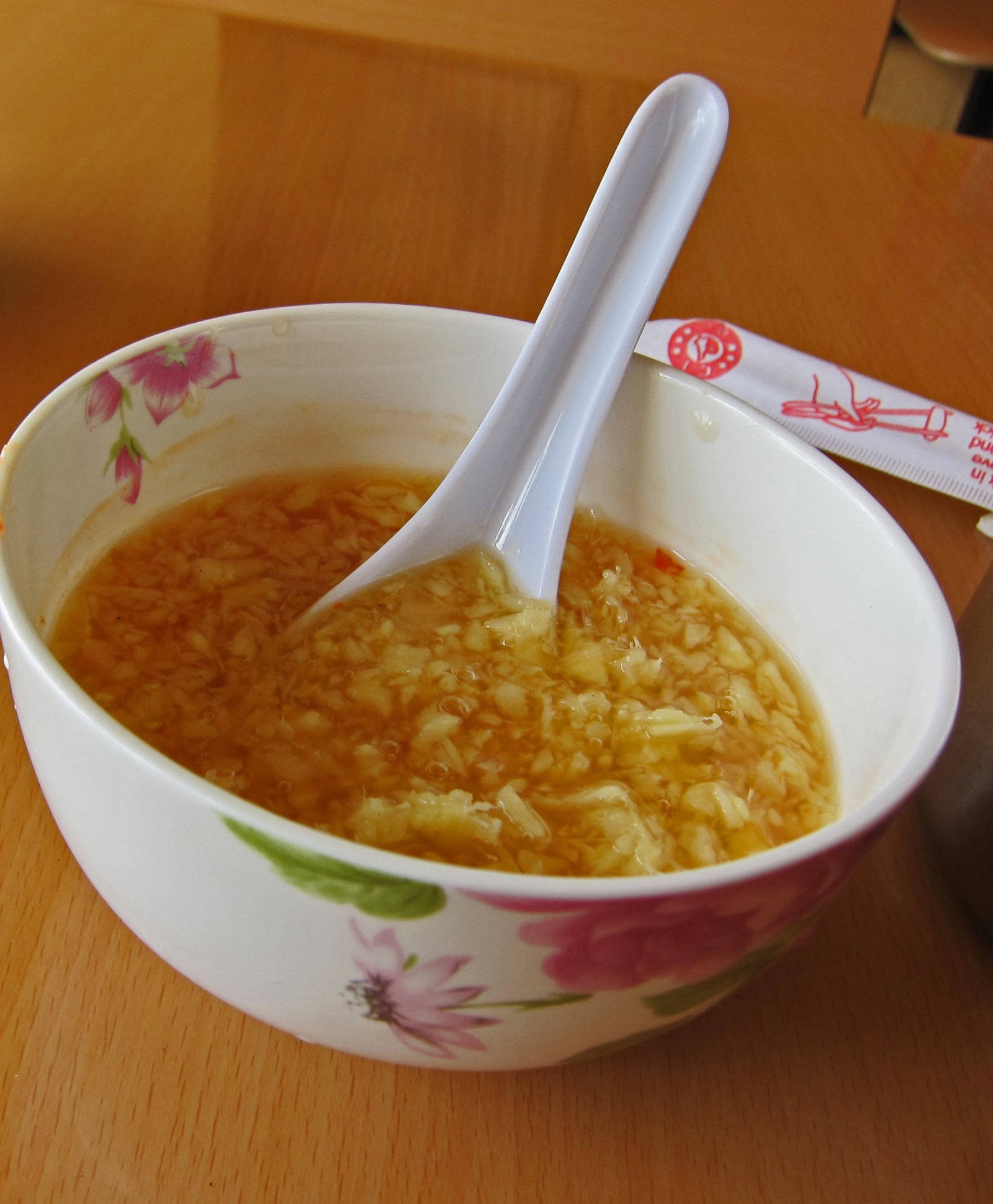 This is basically a clear, I'm thinking chicken based broth, very light in color and texture. Dried bamboo shoots are added…..I like to let it rest for a while so the earthy flavor of the bamboo shoots adds flavor to the broth. The noodles are the "bun", vermicelli. You always get a little bowl of a fairly sweet Nuoc Mam Cham full of minced ginger and garlic and on this day a small styrofoam cup of plain, undiluted fish sauce.
