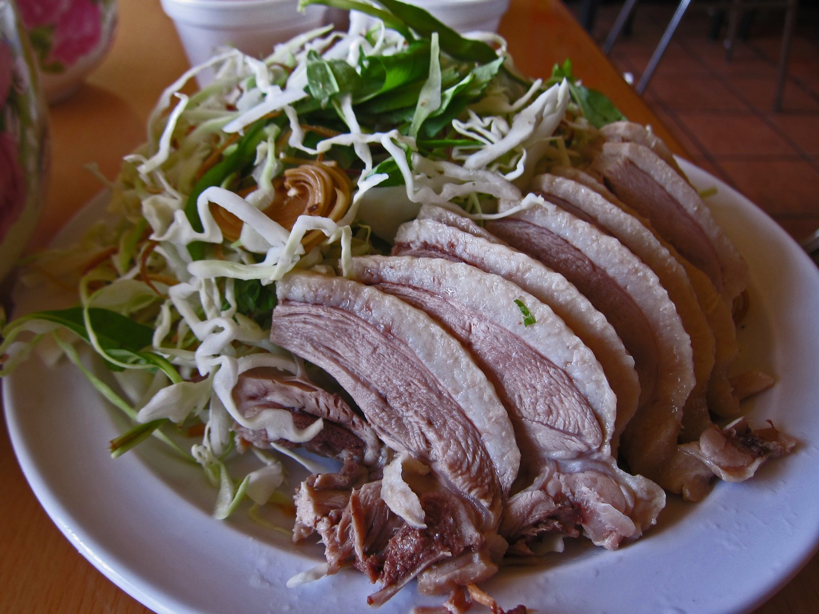 I use this to dip my duck and my veggies, which I soften a bit with a quick dunk in the broth. I've actually caught glimpses of the women prepping duck in the back.
