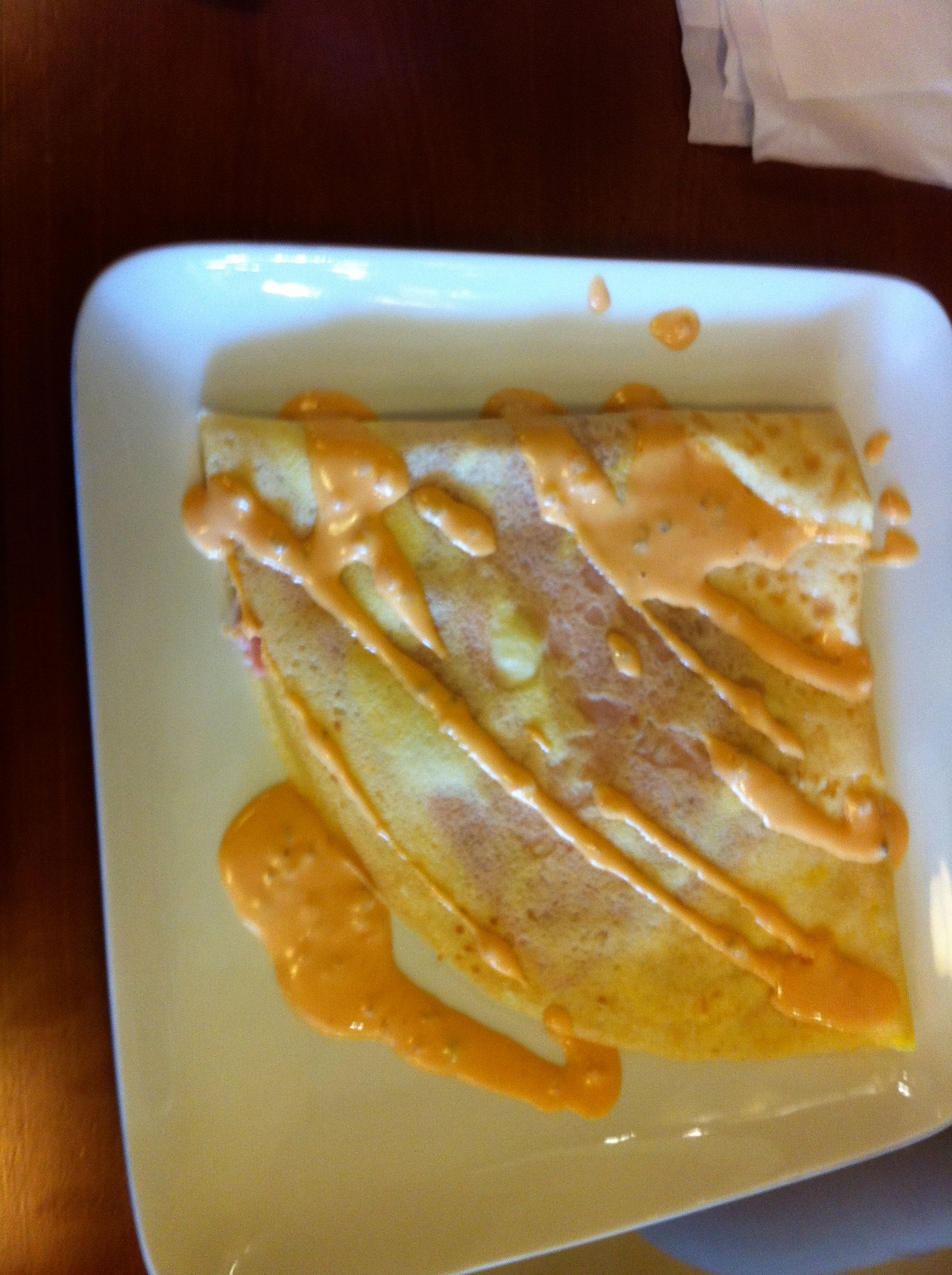 We also had ordered the $3.95 crepe- ham and cheese and (not knowing) asked for Thousand Island as the sauce. This combination of flavors did work. The photo of a cross section of this crepe didn't work.