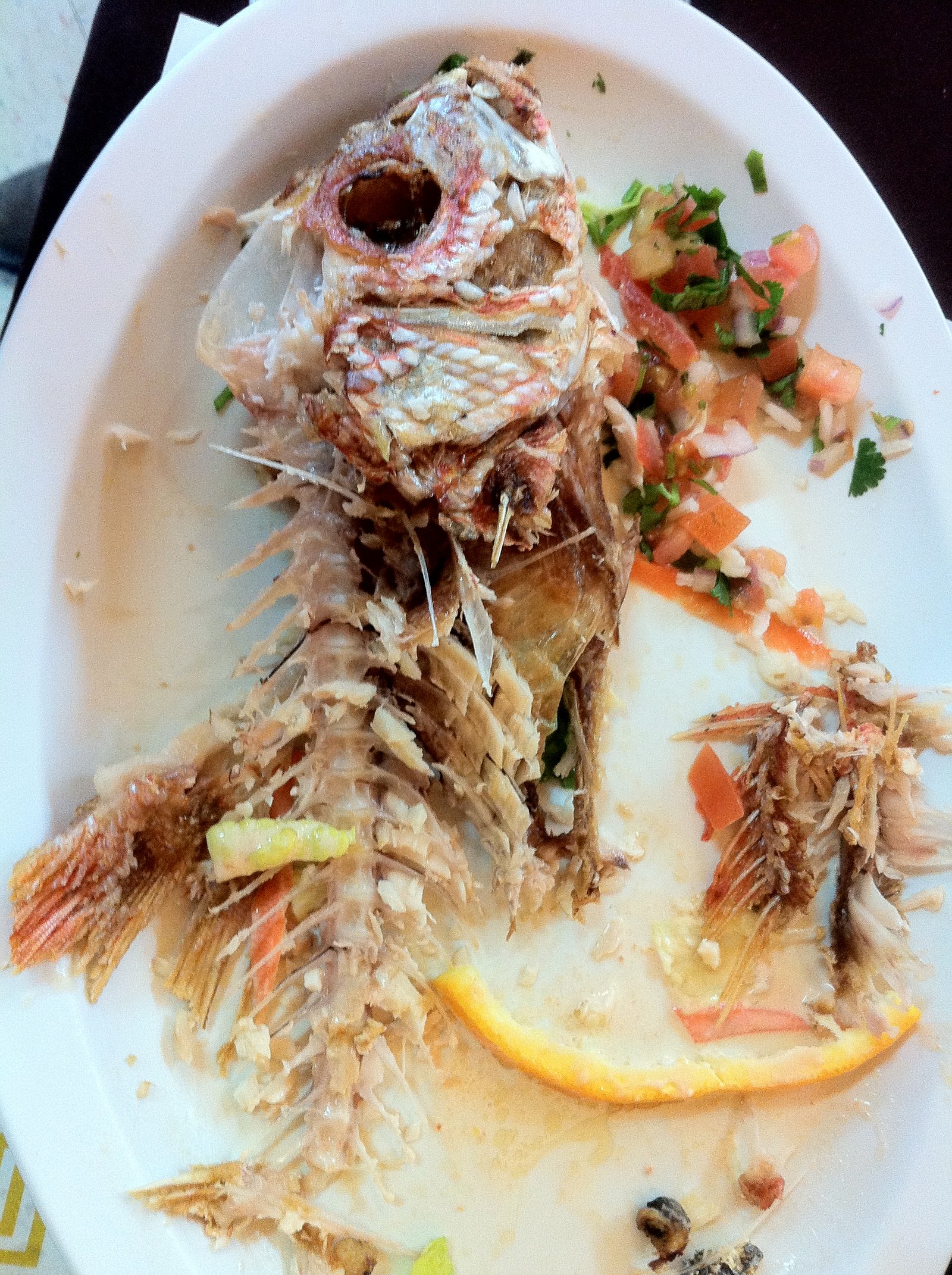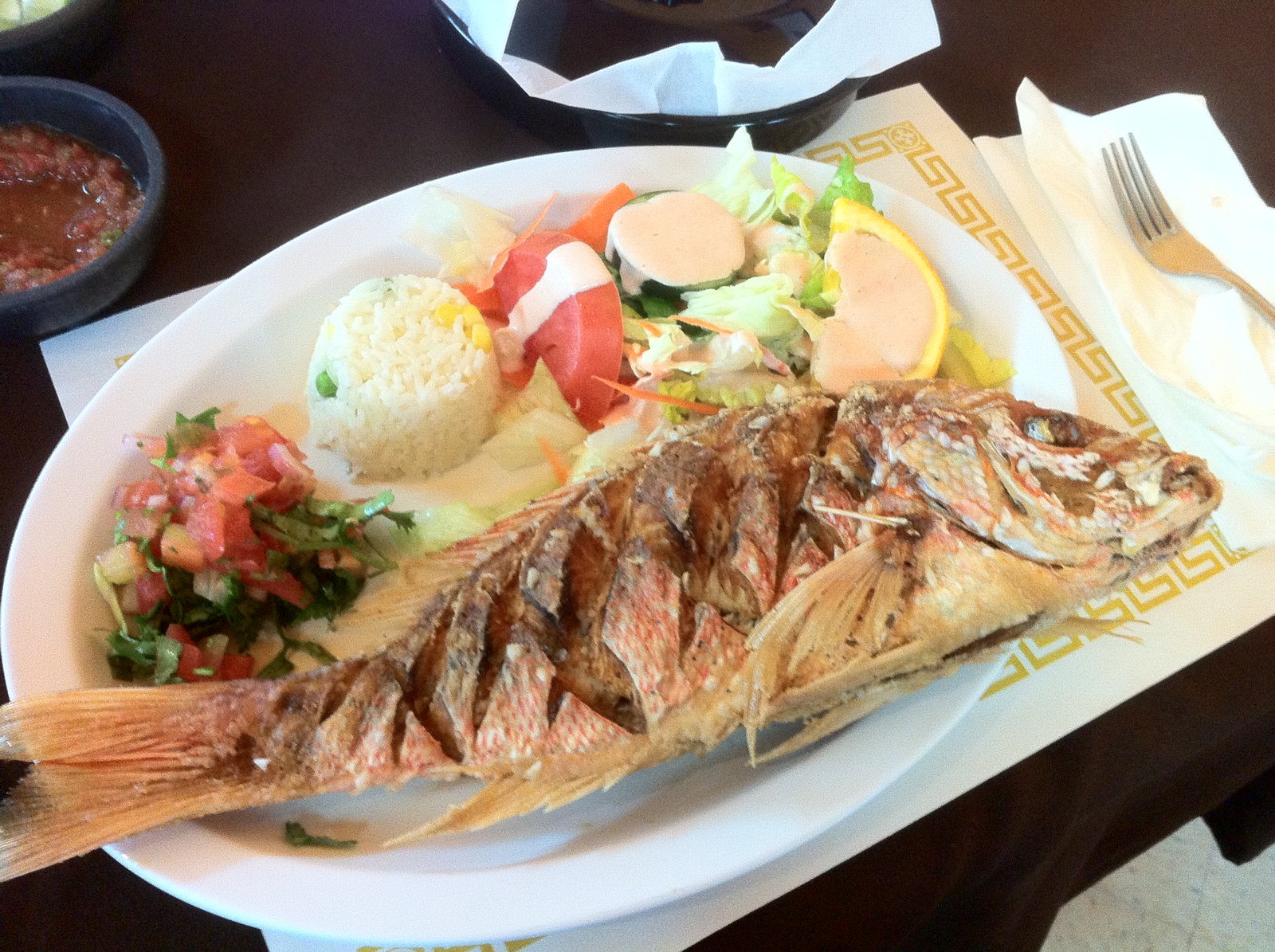 The menu offered whole fish, grilled with garlic or fried and the red snapper and snook are sold by the each for $16.95. The smaller tilapia were $10.95. Larger fish from the counter were sold by weight. This is a fresh red snapper that I chose to have fried. It came with unlimited corn tortillas (which were layered/flaky fresh and very tasty) and the salsa, rice and salad shown. This was a very good preparation and the fish was moist and really tasty.