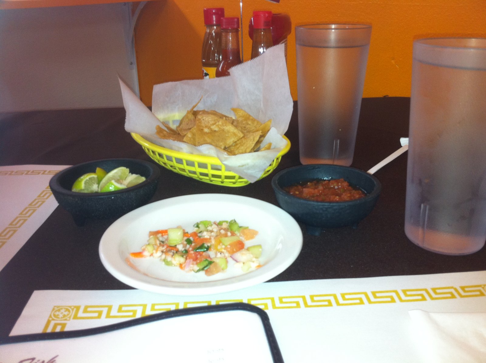 Fresh chips and salsa, along with a bowl of limes and a nice size sample of fresh fish ceviche were brought out to the table with our menus.
