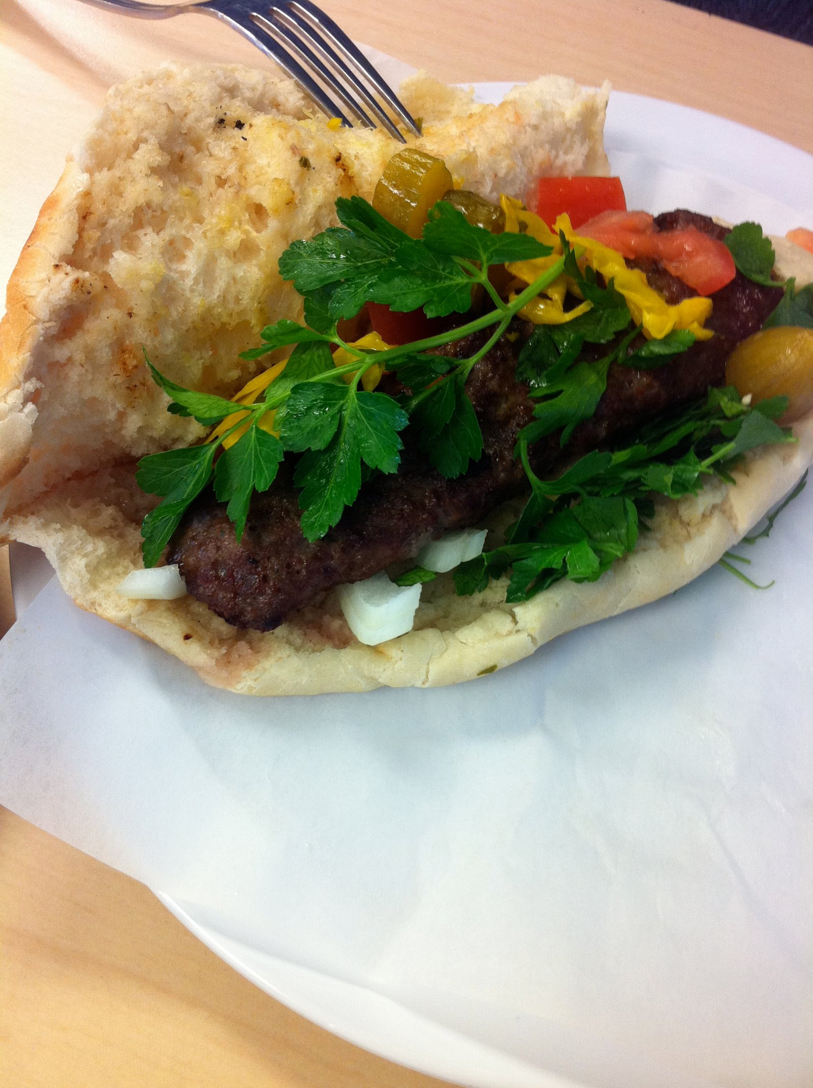The Mister ordered a beef tikka kabob sandwich ($4.99). Finely ground beef mixed with onion and parsley and seasonings and grilled. This was very moist and flavorful. This sandwich was served with all those pickles, tomatoes as well as onions and flat leaf parsley.