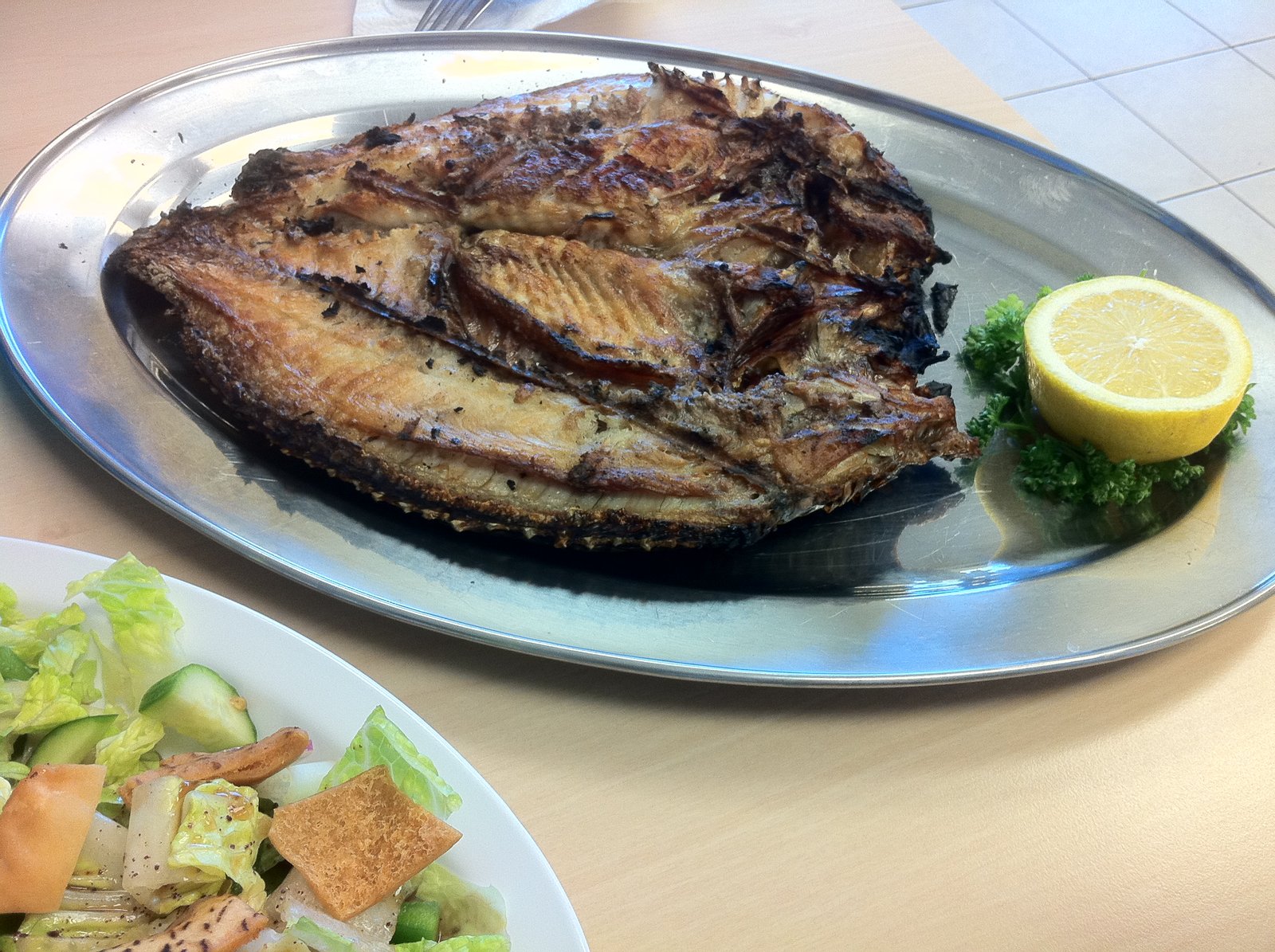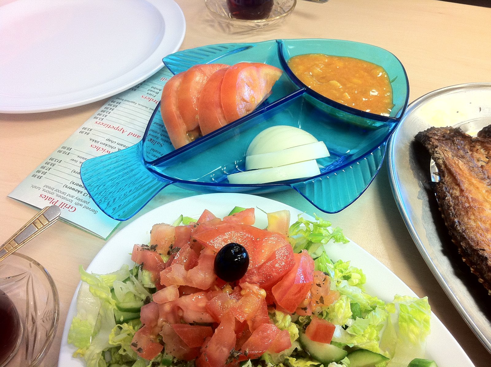 We called in that Friday, telling them we were driving in and would like a tilapia, around 2-3 pounds; that there would be two of us sharing a meal inside the restaurant. We arrived pretty quickly and the food wasn't quite ready and so we decided to order a salad. We could not decide on fatoosh or Arabic salad, and since both are $3.99, we were offered half of each.