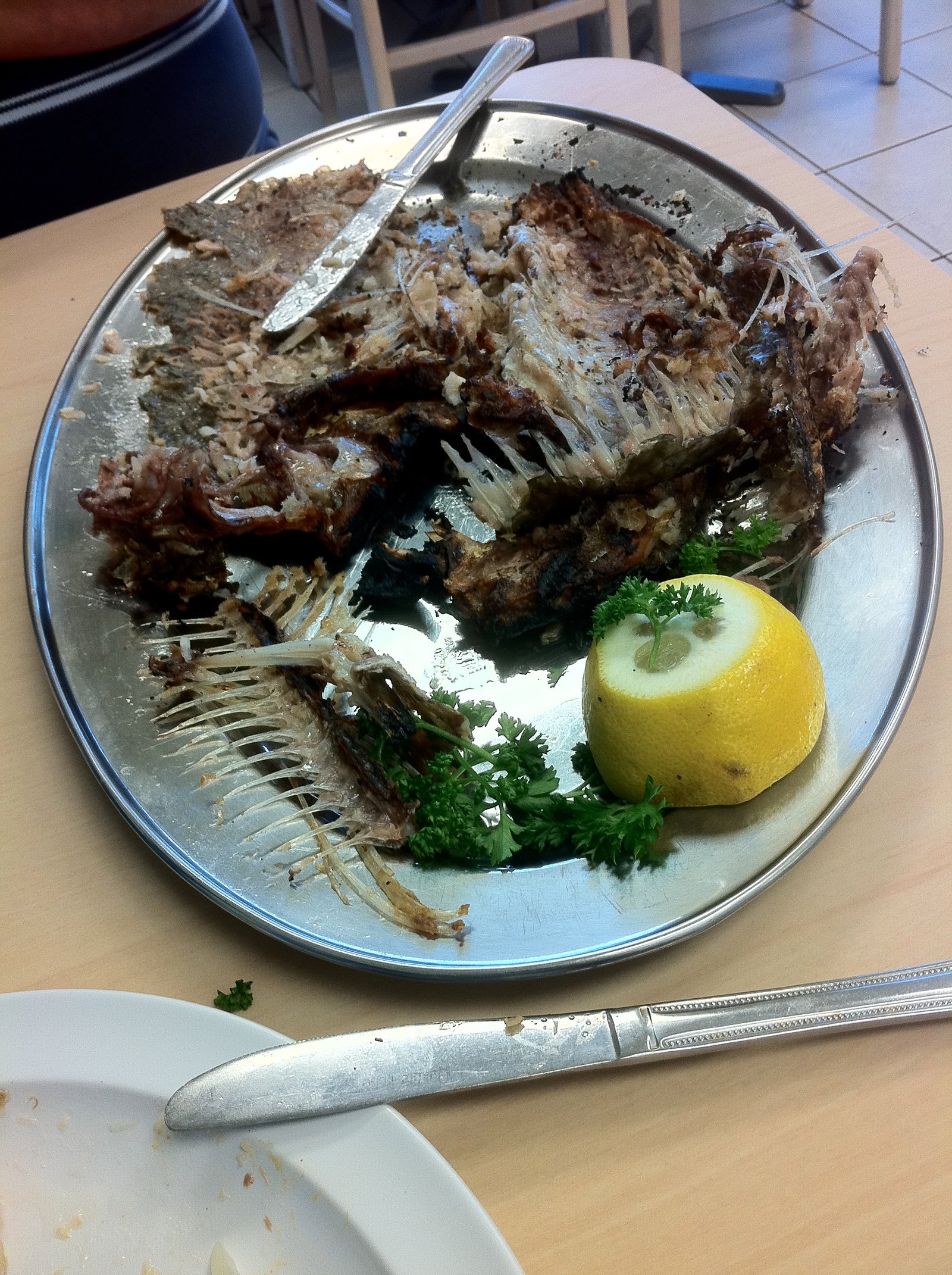 Here is (the now) obligatory photo of The Mister's fancy fish carcass cleaning work. The skin of the fish was not as tasty as other fish skin I've had, but the fins were crispy good. Also, this was tilapia, a fish with a double skeleton going on…so not as easy to eat as other fish.