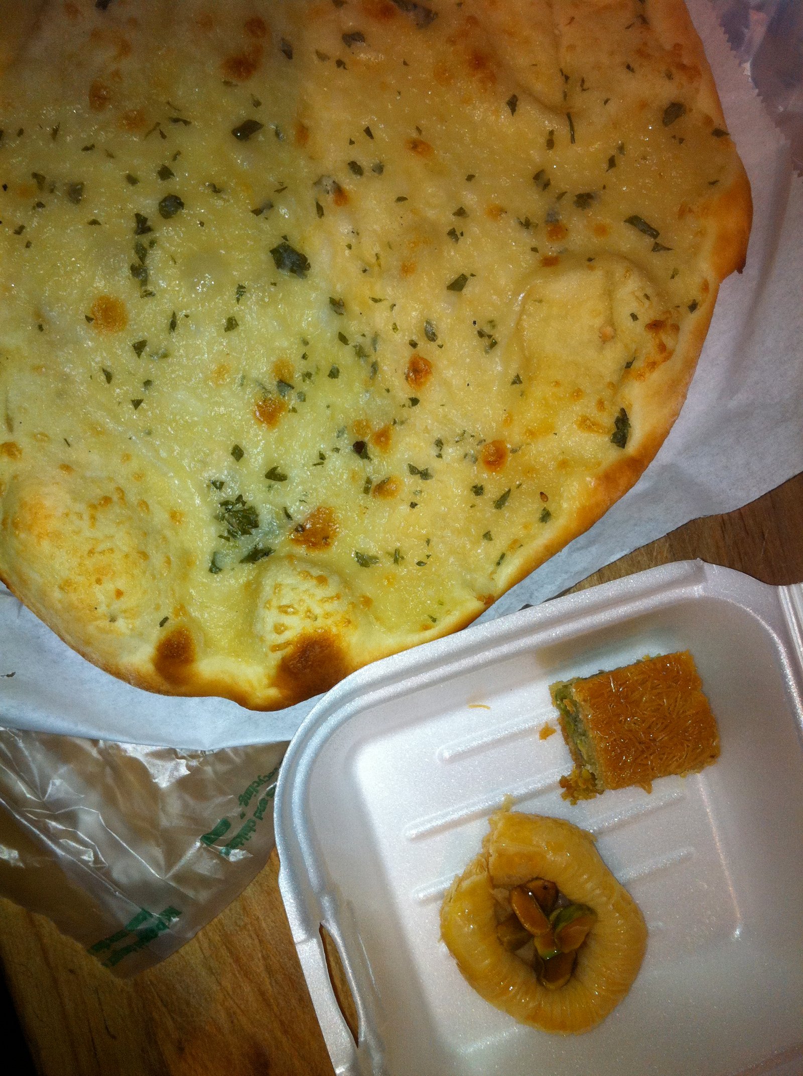 Then we exercised restraint and each of us chose one sweet piece of dessert. The top/square piece is filled with chopped pistachios and topped with shredded filo. The bottom round one has whole pistachios. Sold by weight ($8/lb) the price for these two pieces was $1.08. These were not too sweet and made with a light syrup rather than honey. The filo dough remained crispy until the next morning.
