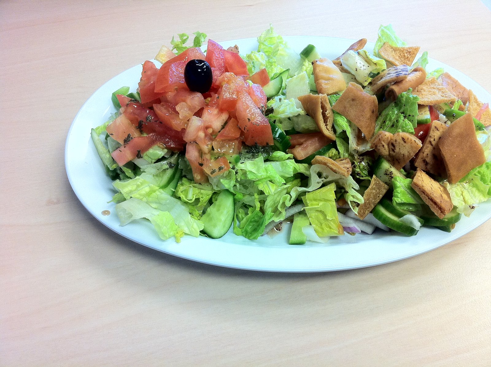 The Arabic salad, on the left, is mainly lettuce, cucumber, green pepper and tomatoes and a delightful dressing that has fresh mint. The Fatoosh salad has fried pita bread croutons and an equally delightful, fresh and different dressing. This is a large plate.