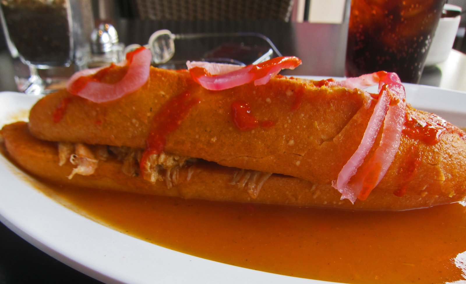 Soon enough my sandwich arrived. It based on the looks and texture, instead of drowning the sandwich, the chile de arbol based sauce had been poured over the sandwich. Still it looked pretty good.