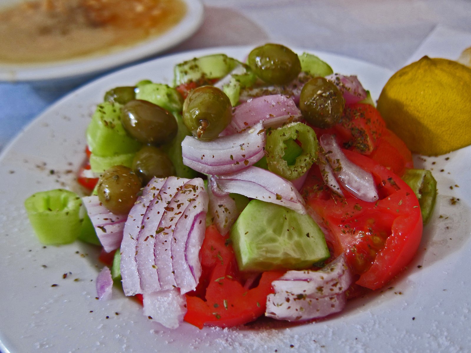 Nice to see Greek salad in Greece….surprised no feta cheese? And i’m used to black olives LOL