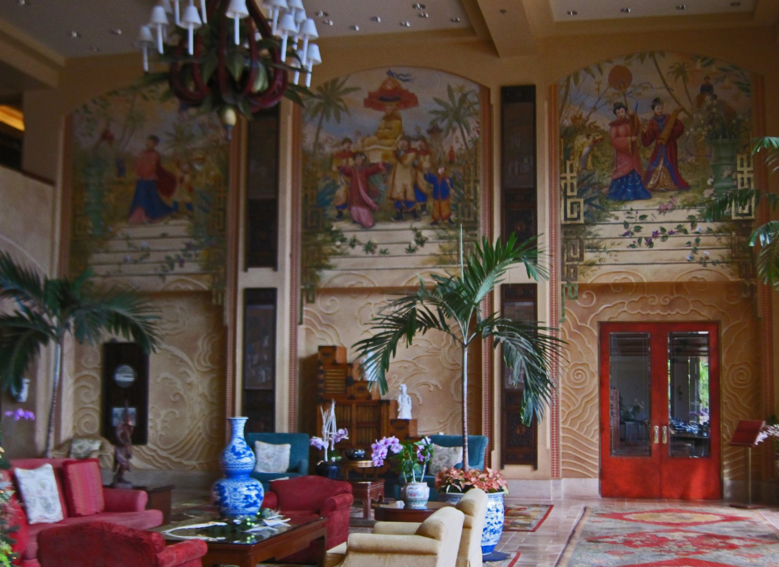 The lobby of the hotel is beautiful with a strong Asian theme.