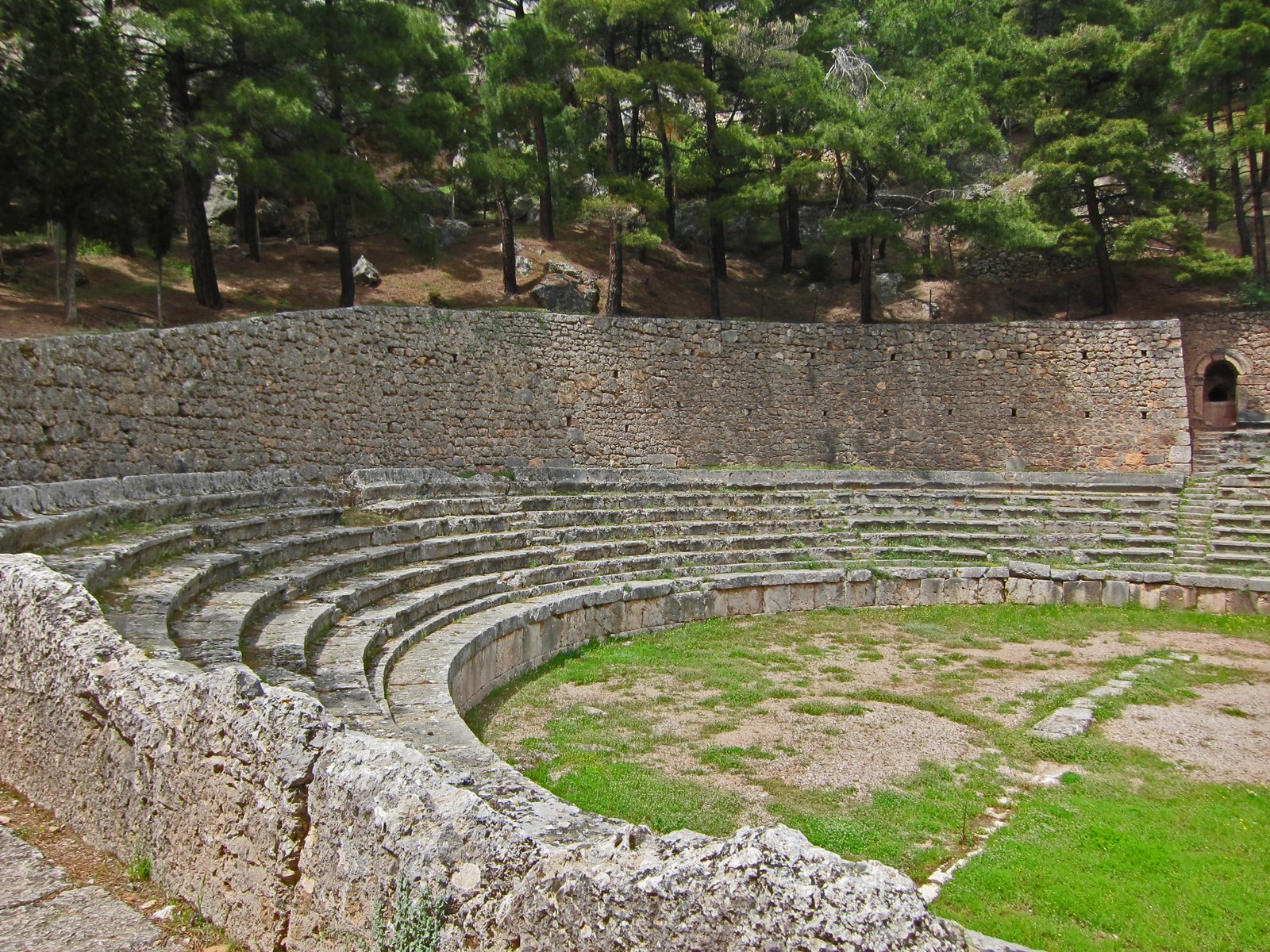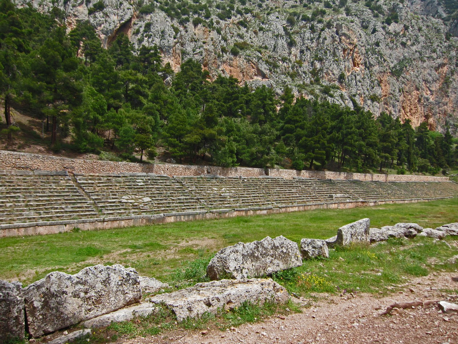 Around the 6th century BC, Delphi held the Pythian Games every four years, between the Olympic Games. Athletes from all over Greece competed in a number of events. Up that hill is the stadium, a long (about 550 ft) and fairly narrow (about 84 feet) track.