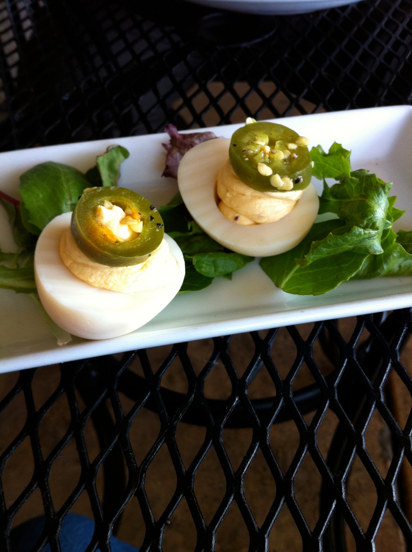 Deviled eggs. The yolk is mixed with beer and then piped back into the whites and topped with a jalapeño. A few of these would be a perfect snack or small meal for me.
