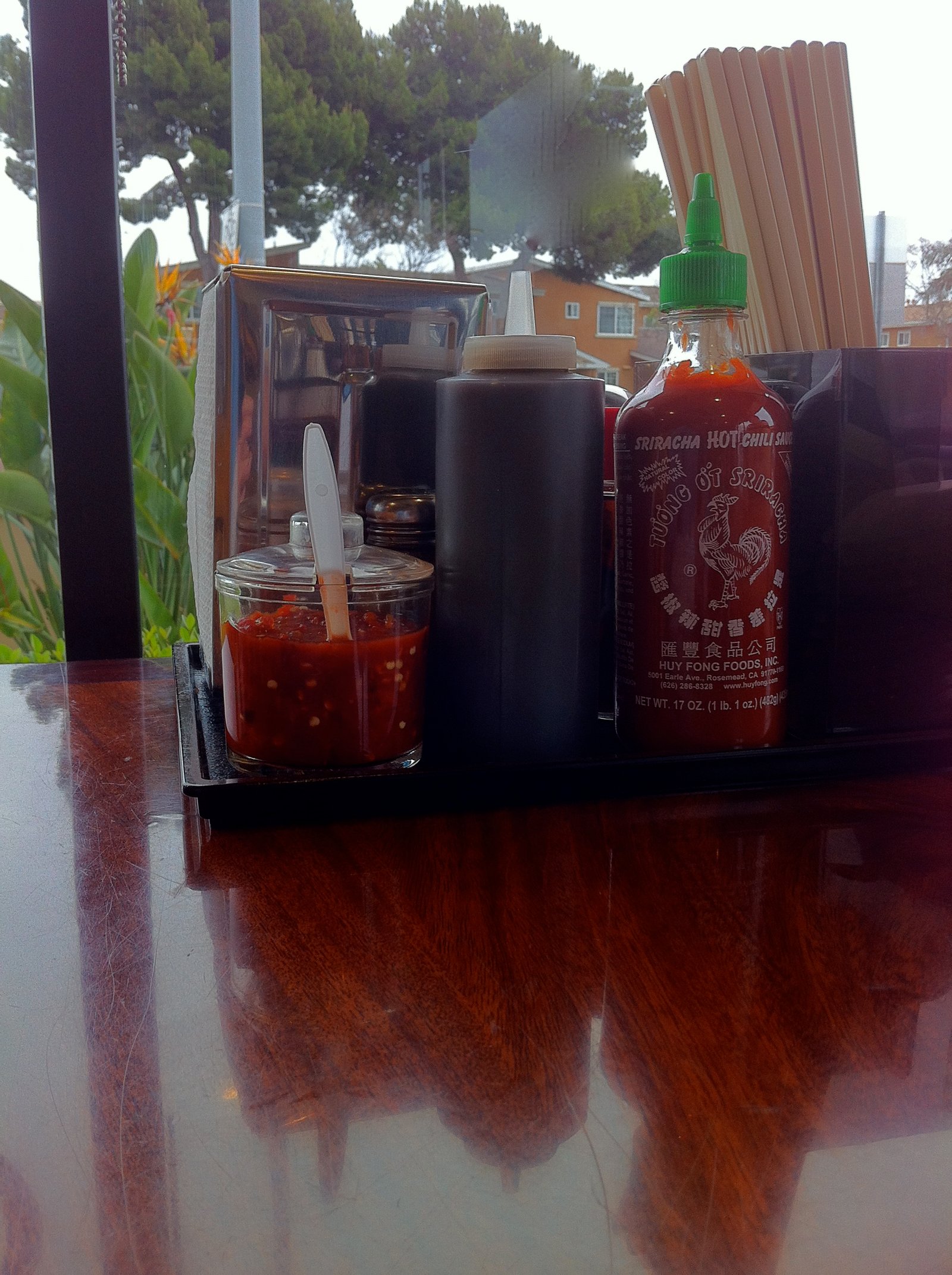 The condiments on the table are standard. The tables are highly laquered. There are two televisions and on this day, both were playing a black and white Mexican (not translated) Cowboy movie.
