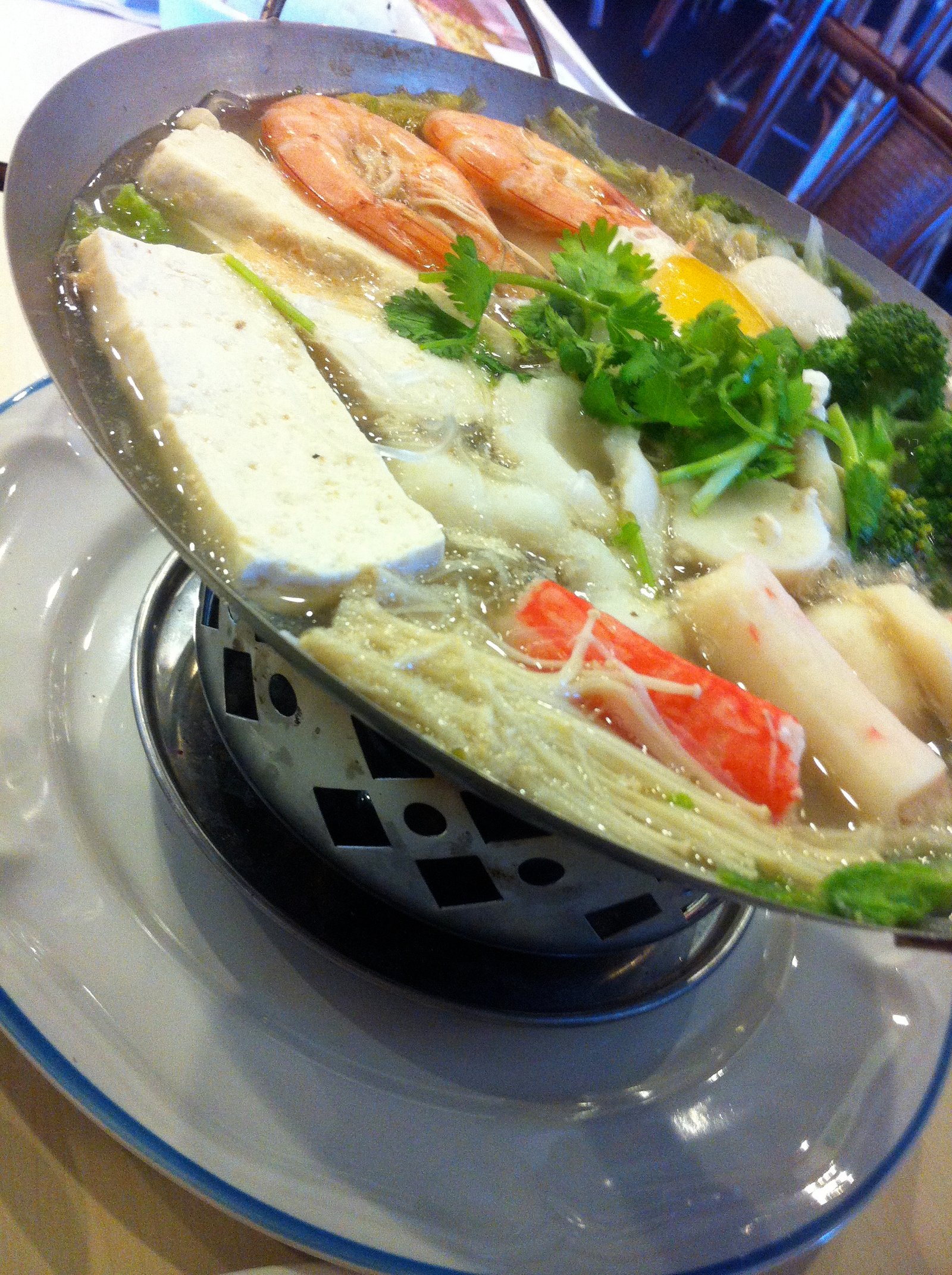 The seafood. Served in a mini wok on top of a nice stand which held a sort of sterno heat source which was lighted at the table, this didn't need any add ins and in fact, the dumplings could not be added in right away because the pot was filled. There were several pieces of a flaky white fish, some squid rings, two head on shrimp, fresh tofu, several types of mushrooms, fish cake, krab and an egg along with broccoli and bok choy. All in a very rich seafood broth which was not salty. There were also clear rice noodles on the bottom of the pot AND a choice of rice or noodles came with the pot. (The Mister chose the (very good) sticky rice) .